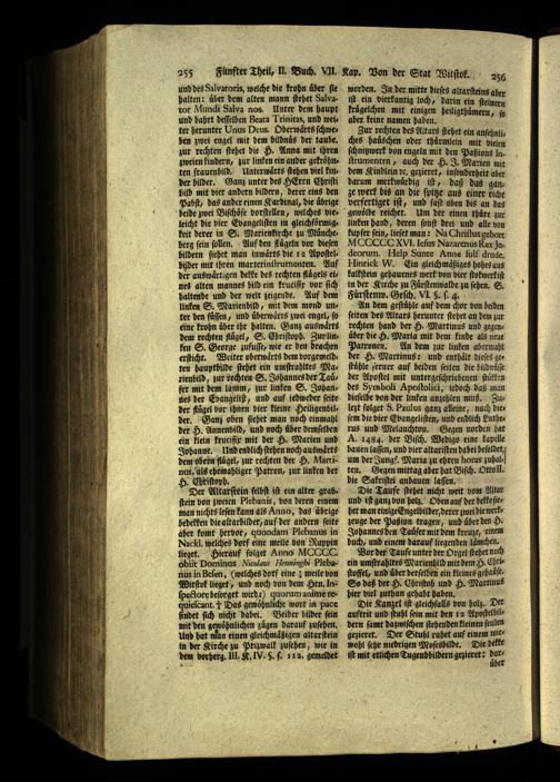 An dem geſtuͤhle auf dem chor von beiden ſeiten des Altars herunter ſtehet an dem zur rechten hand der H. Martinus und gegen= über die 9. Maria mit dem Finde als neue Patronen. An dem zur linken abermahl der H. Martinus: und enthält dieſes ge» fühle ferner auf beiden ſeiten die hildnuͤſſ der Apoſtel mit untergeſchriebenen ſtuͤkken des Symboli Apoſtolici, iedoch daß man dieſelbe von der linken anzehlen muß. Zulezt folget 8. Paulus ganz alleine, nach dieſem die vier Ebangeliſten, und endlich Lutherus und Melanchton. Gegen norden hat A. 1484. der Biſch. Wedigo eine kapelle bauen laſſen, und vier altariſten dabei beſoldet, um der Jungf. Maria zu ehren horas zuhalten. Gegen mittag aber hat Biſch. Ottoll. die Sakriſtei anbauen laſſen.