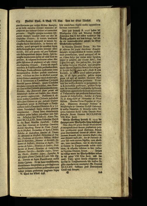 exceptionibus ibidem poſitis confirmamus, videlicet ut Civer in Wizßock utantur eo jure Ciwitatic quo utuntur Incole Sendalenſes. Et ſi ſententiam a Conſulibus Civitatis Stendal petere debeant, quam Conſules ejusdem Civitatis vel Scabini, non libenter ſine noſtre Civitatis gravamine demonſtrarent, illuc ſententiam ſuam petant ubi Stendalenfes Scabini vel Confüles fuas Sententias querere conſueveruint. Poſtremo& ulrimo noſtre Gonſules Civitatis judicabunt infra ſcpta Civitatis eũd que judicant Confüles Stendalenfes prout in Privilegiis a Predeceſſore noftro Domino Heinrico& a Civitate Stendalenſi ſupra traditis plenius continentur. Preter hanc donationem noſtram prius habito cujuslibet jure Salvo. Ada ſunt hec Więſtock. Anno Domini MCCLXXV. Sexto Kalendas Marci in die Beati Matthie Apoſtoli. Teſtes vero ſunt Heinricus de Gardelege Canonicus Ecclefie Havelherg. Petrus de Ploniz Prepofizus in Wizflock, Hermannus de Kyriz Clerici. Zabellus de Pedichſtorp, Z̃abellus de Plume. Yo Advocatus in Wizflock. Hermannus de Plave, Fredericus de Grambow Milites. Wilhelmus-de Wärnekow, Johannes de Rorebee, Johannes de Rolſtede, Heinricus de iogeiz, Geyardus de Palniz» Heinricus de Lindos, Everpardus de Brand, Heinricus de Langevelde, Johannes Currifex» Ludolſus Lupus» Gerardus Düzke, Johannes Lupus, Dyonifius& alũ quam plures Clerici& Laici fide digni. Datum ut ſupra Pontificatus noftri Anno Quinto. Et ne hane venditionem, donationem ſive gratiam ac privilegiorum confirmationem noſtram poſtmodum quis valeat irritare preſentem paginam ſuper V. Theil der Maͤrk. Hiſt.