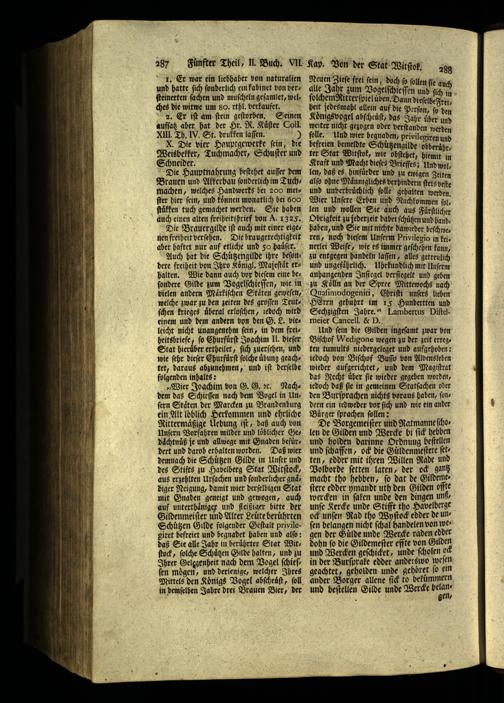 Und fein die Gilden ingeſamt zwar von Biſchof Wedigone wegen zu der zeit erregten tumults niedergeleget und aufgehoben: iedoch bon Biſchof Buſſo von Alvensleben wieder aufgerichtet, und dem Magiſtrat das Recht uͤber ſie wieder gegeben worden, iedoch daß ſie in gemeinen Statſachen oder den Burſprachen nichts voraus haben, ſondern ein iedweder bor ſich und wie ein ander Buͤrger ſprachen ſollen: