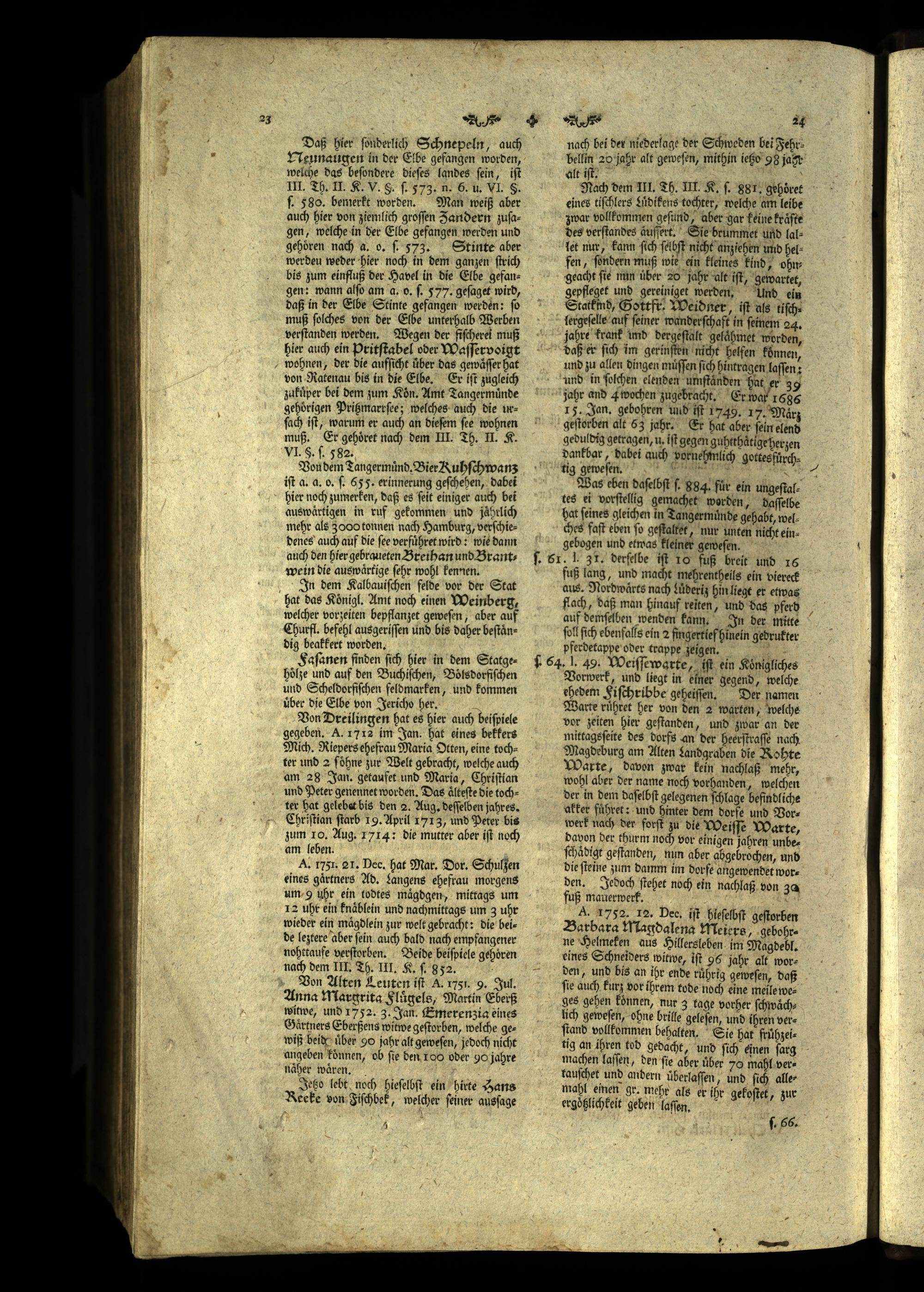 A. 1752. 12. Dec, iſt hieſelbſt geſtorben Barbara Magdalena Meiers. gebohrne Helmeken aus Hillersleben im Magdebl. eines Schneiders witwe, iſt 9s jahr alt worden, und bis an ihr ende rührig geweſen, daß ſie auch kurz vor ihrem tode noch eine meile weges gehen konnen, nur 3 tage vorher ſchwaͤchlich geweſen, ohne brille geleſen, und ihren verſtand vollkommen behalten. Sie hat fruͤhzeitig an ihren tod gedacht, und ſich einen ſarg machen laſſen, den fie aber über 70 mahl vertauſchet und andern uͤberlaſſen, und ſich allemahl einen gr. mehr als er ihr gekoſtet, zur ergöͤtzlichkeit geben laſſen. ſ. 66.