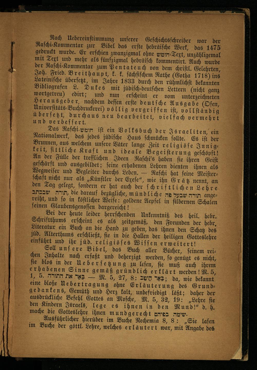 Nach Uebereinſtimmung unſerer Geſchichtsſchreiber war der Raſchi⸗Kommentar zur Bibel das erſte hebräiſche Werk, das 1475 gedruckt wurde. Er erſchien zwanzigmal ohne wom⸗Text, unzähligemal mit Text und mehr als fünfzigmal hebräiſch kommentirt. Auch wurde der Raſchi⸗Kommentar zum Pentateuch von dem chriſtl. Gelehrten, Joh. Fried. Breithaupt, k. k. ſächſiſchem Rathe(Gotha 1718) ins Lateiniſche überſetzt, im Jahre 1833 durch den rühmlichſt bekannten Bibliografen L. Dukes mit jüdiſch⸗deutſchen Lettern(nicht ganz wortgetreu) edirt; und nun erſcheint er vom unterzeichneten Herausgeber, nachdem deſſen erſte deut ſche Ausgabe(Ofen, Univerſitats⸗Buchdruckerei) völlig vergriffen iſt, vollſtändig ü berſetzt, durchaus neu bearbeitet, vielfach vermehrt und verbeſſert./ Das Raſchi rn iſt ein Volksbuch der Israeliten, ein Nationalwerk, das jedes jüdiſche Haus ſchmücken ſollte. Es iſt der Brunnen, aus welchem unſere Väter lange Zeit religisſe Innigkeit, ſitt liche Kraft und ideale Begeiſterung geſchöpft! An der Fülle der trefflichen Ideen Raſchiſs haben fie ihren Geiſt geſchärft und ausgebildet; ſeine erhabenen Lehren dienten ihnen als