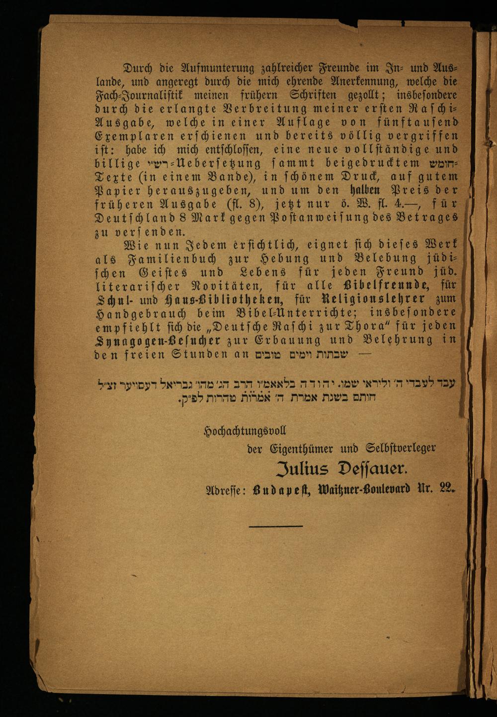 Hochachtungs voll der Eigenthümer und Selbſtverleger Julius Deſſauer. Adreſſe: Budapest, Waitzner-Boulevard Nr. 22.