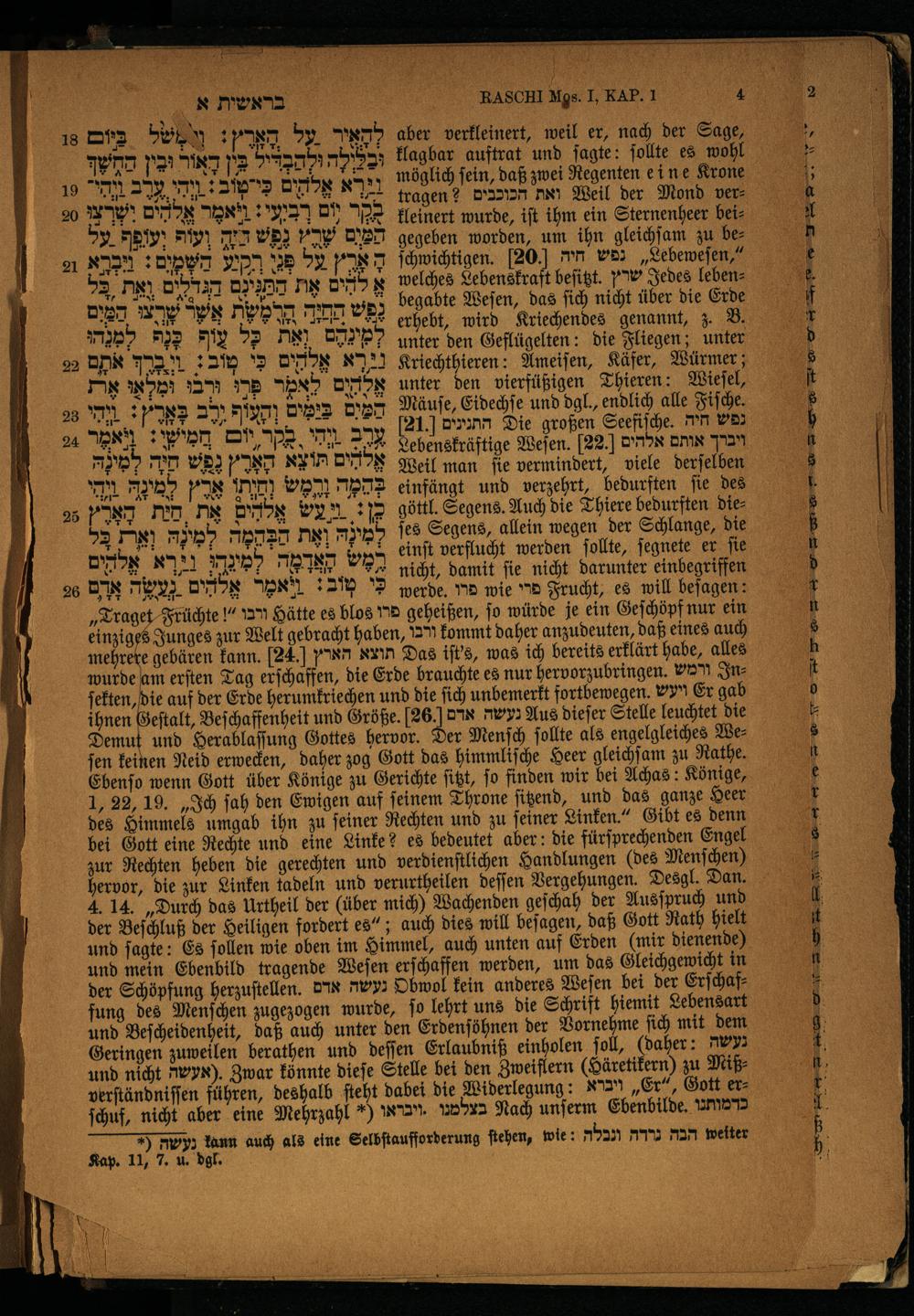 wurde am erſten Tag erſchaffen, die Erde brauchte es nur hervorzubringen. טוה ורמש er, die auf der Erde herumkriechen und die ſich unbemerkt fortbewegen. ויעש Er gab ihnen Heſtalt, Beſchaffenheit und Größe. 26 נעשה אדם Aus dieſer Stelle leuchtet die ö und Herablaſſung Gottes hervor. Der Menſch ſollte als engelgleiches Weſen keihen Neid erwecken, daher zog Gott das himmliſche Heer gleichſam zu Rathe. Ebenſo wenn Gott über Könige zu Gerichte ſitzt, ſo finden wir bei Achas: Könige, 1, 22, 19.„Ich ſah den Ewigen auf ſeinem Throne ſitzend, und das ganze Heer des Himmels umgab ihn zu ſeiner Rechten und zu ſeiner Linken.“ Gibt es denn bei Gott eine Rechte und eine Linke? es bedeutet aber: die fürſprechenden Engel zur Rechten heben die gerechten und verdienſtlichen Handlungen(des Menſchen) hervor, die zur Linken tadeln und verurtheilen deſſen Vergehungen. Desgl. Dan. 4. 14.„Durch das Urtheil der(über mich) Wachenden geſchah der Ausſpruch und der Beſchluß der Heiligen fordert es“; auch dies will beſagen, daß Gott Rath hielt und ſagte: Es ſollen wie oben im Himmel, auch unten auf Erden(mir dienende) und mein Ebenbild tragende Weſen erſchaffen werden, um das Gleichgewicht in der Schöpfung herzuſtellen. נעשה אדם Obwol kein anderes Weſen bei der Erſchaf fung des Menſchen zugezogen wurde, ſo lehrt uns die Schrift hiemit Lebensart und Beſcheidenheit, daß auch unter den Erdenſöhnen der Vornehme ſich mit dem Geringen zuweilen berathen und deſſen Erlaubniß einholen ſoll,(daher: נעשה und nicht wyx). Zwar könnte dieſe Stelle bei den Zweiflern(Häretikern) zu Miß verſtändniſſen führen, deshalb ſteht dabei die Widerlegung: Kaan„Er“, Gott erſchuf, nicht aber eine Mehrzahl) 1872”. בצלמנו Nach unſerm Ebenbilde. כדמותנו|| .*( נעשה kann auch als eine Selbſtaufforderung ſtehen, wie: הבה גרדה ונבלת welter Kap. 11, 7. u. dgl.