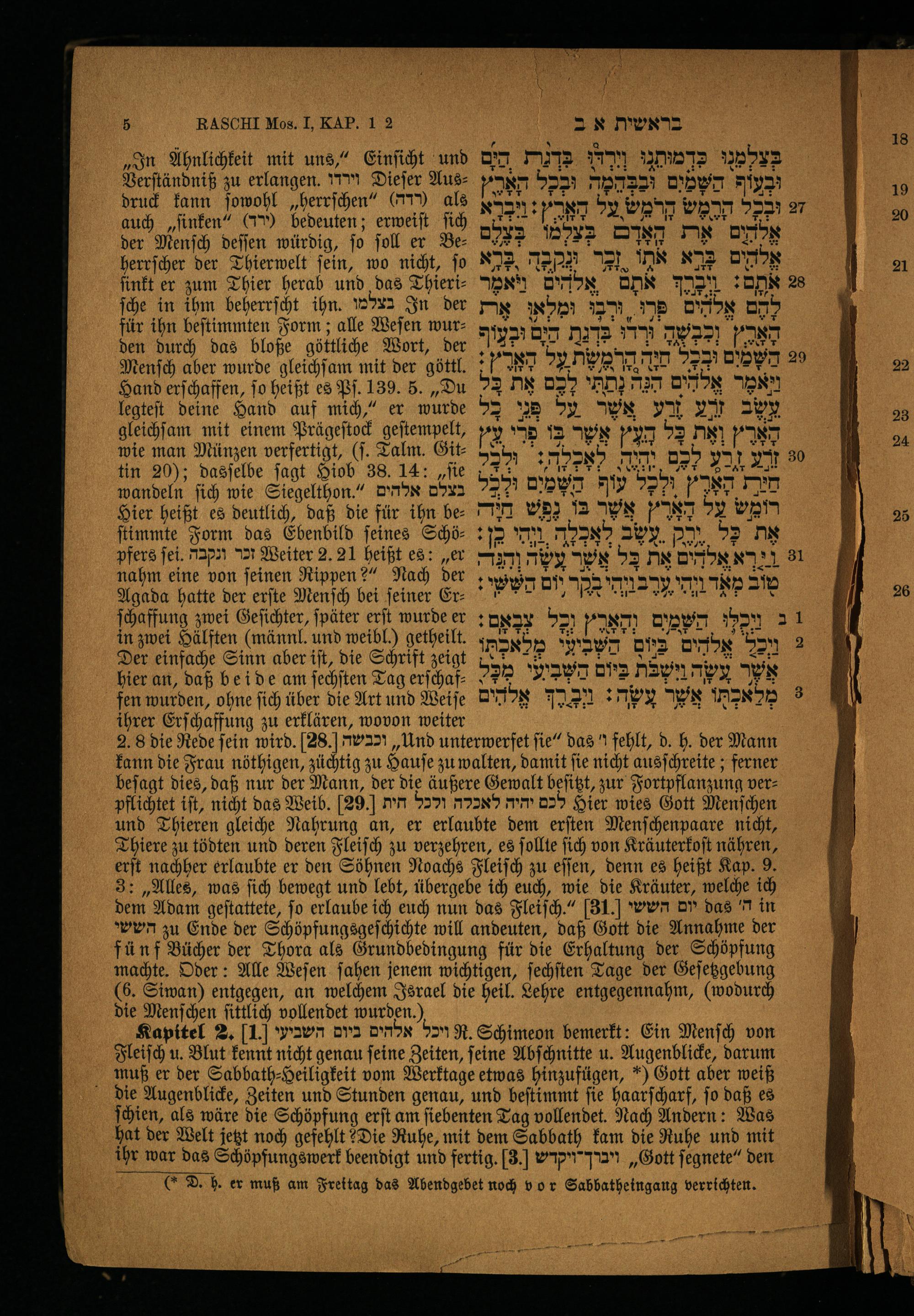 Hier heißt es deutlich, daß die für ihn be: רומש על הָארֶץ אשר בו נפש חידה ſtimmte Form dag Ebenbild feines ₪8 כן: WM עשב לְאְכְלָה DD, אֶת כָּל . 161. זכר ונקבה ö 1. ,, ויר אלבים את בל אשר nahm eine von ſeinen Rippen?“ Nach der ‚= לור מאד ויחו טרב וודו סרה וום Agada hatte der erſte Menſch bei ſeiner Er ⸗ ,,, ö ית ה ſpäter ö 9 צַבָאָם: de השמים וְהָאָרֶץ on 1 in zwei Hälften(männl. und weibl.)( השביעי מלאכתו Dis ויכל אלהים 9 Der einfache Sinn aber iſt, die Schrift זו 12T ten htm D בשש hier an, daß beide am ſechſten Tag erſchaf⸗ 7 ביום השביעי מכ Ma אָשָר 2 שה fen wurden, ohne ſich über die Art und Weife עשה: וְבְרַך אַלהים wi מַלאבְתו 3 ihrer Erſchaffung zu erklären, wovon weiter 2. 8 die Rede ſein wird. 28. וכבשה, Und unterwerfet fie“ das) fehlt, d. h. der Mann kann die Frau nöthigen, züchtig zu Hauſe zu walten, damit ſie nicht ausſchreite; ferner beſagt dies, daß nur der Mann, der die äußere Gewalt beſitzt, zur Fortpflanzung verpflichtet iſt, nicht das Weib. 25 לכם יהיה לאכלה ולכל חית Hier wies Gott Menſchen und Thieren gleiche Nahrung an, er erlaubte dem erſten Menſchenpaare nicht, Thiere zu tödten und deren Fleiſch zu verzehren, es ſollte ſich von Kräuterkoſt nähren, erſt nachher erlaubte er den Söhnen Noachs Fleiſch zu eſſen, denn es heißt Kap. 9. 3:„Alles, was ſich bewegt und lebt, übergebe ich euch, wie die Kräuter, welche ich dem Adam geſtattete, fo erlaube ich euch nun das Fleiſch.“ 31 יום הששי das ה' in הששי zu Ende der Schöpfungsgeſchichte will andeuten, daß Gott die Annahme der fünf Bücher der Thora als Grundbedingung für die Erhaltung der Schöpfung machte. Oder: Alle Weſen ſahen jenem wichtigen, ſechſten Tage der Geſetzgebung (6. Siwan) entgegen, an welchem Israel die heil. Lehre entgegennahm,(wodurch die Menſchen ſittlich vollendet wurden.) Kapitel 2. 1 ויכל אלהים ביום השביעי R. Schimeon bemerkt: Ein Menſch von Fleiſch u. Blut kennt nicht genau ſeine Zeiten, ſeine Abſchnitte u. Augenblicke, darum ſuß er der Sabbath⸗Heiligkeit vom Werktage etwas hinzufügen,*) Gott aber weiß die Augenblicke, Zeiten und Stunden genau, und beſtimmt ſie haarſcharf, ſo daß es ſchien, als wäre die Schöpfung erſt am ſiebenten Tag vollendet. Nach Andern: Was hat der Welt jetzt noch gefehlt Die Ruhe, mit dem Sabbath kam die Ruhe und mit ihr war das Schöpfungswerk beendigt und fertig. 3 ויברך"ויקדש„Gott ſegnete“ den