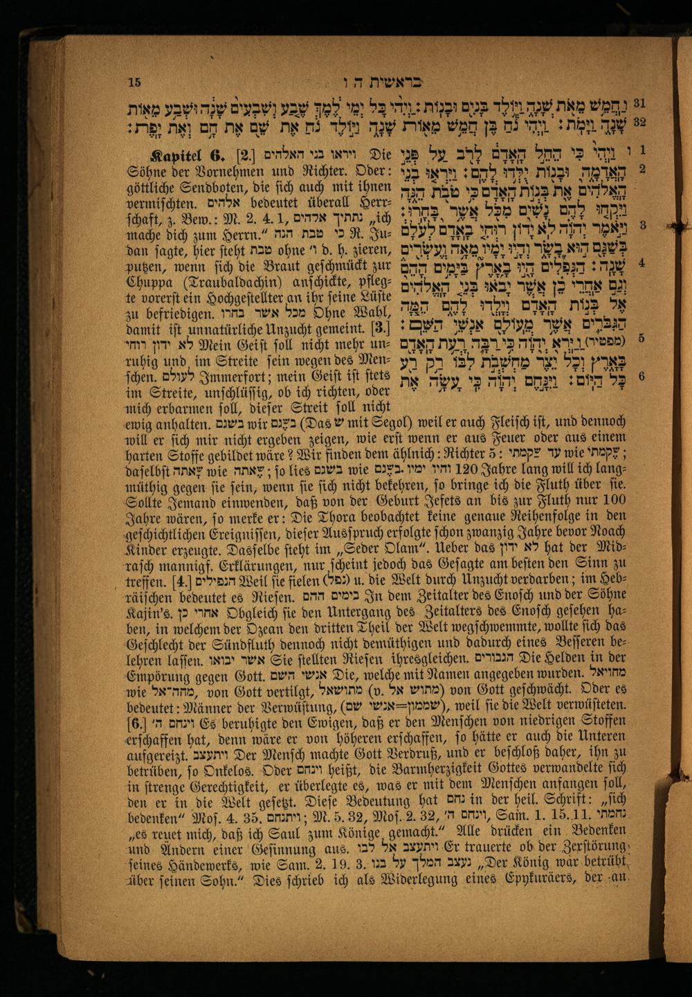 räiſchen bedeutet es Rieſen. בימים ההם In dem Zeitalter des Enoſch und der Söhne Kajin's. 15 אחרי Obgleich fie den Untergang des Zeitalters des Enoſch geſehen haben, in welchem der Dzean den dritten Theil der Welt wegſchwemmte, wollte ſich das Geſchlecht der Sündfluth dennoch nicht demüthigen und dadurch eines Beſſeren belehren laſſen. rm. אשר Sie ſtellten Rieſen ihresgleichen. Mann Die Helden in der Empirung gegen Gott. אנשי השם Die, welche mit Namen angegeben wurden. מחויאל wie ,מחהדאל von Gott vertilgt,(מתוש אל.'( מתושאל von Gott geſchwächt. Oder es bedeutet: Männer der Verwüſtung,(שממון=אנשי שם), weil fie die Welt verwüſteten. 6 n וינחם 65 beruhigte den Ewigen, daß er den Menſchen von niedrigen Stoffen erſchaffen hat, denn wäre er von höheren erſchaffen, ſo hätte er auch die Unteren aufgereizt. ויתעצב Der Menſch machte Gott Verdruß, und er beſchloß daher, ihn zu betrüben, fo Onkelos. Oder רכחם heißt, die Barmherzigkeit Gottes verwandelte ſich in ſtrenge Gerechtigkeit, er überlegte es, was er mit dem Menſchen anfangen ſoll, den er in die Welt geſetzt. Dieſe Bedeutung hat DM in der heil. Schrift:„ich bedenken Moſ. 4. 35. ויתנחם; M. 5. 32, Moſ. 2. 32, 7 dnn, Sain. 1. 15.11. נחמתי „es reuet mich, daß ich Saul zum Könige, gemacht.“ Alle drücken ein Bedenken und Andern einer Geſinnung aus. 127 ויתעצב אל Er trauerte ob der Zexſtörung ſeines Händewerks, wie Sam. 2. 19. 3. בנו by נעצב המלך„Der König war betrübt. über feinen Sohn.“ Dies ſchrieb ich als Widerlegung eines Epykuräers, der au