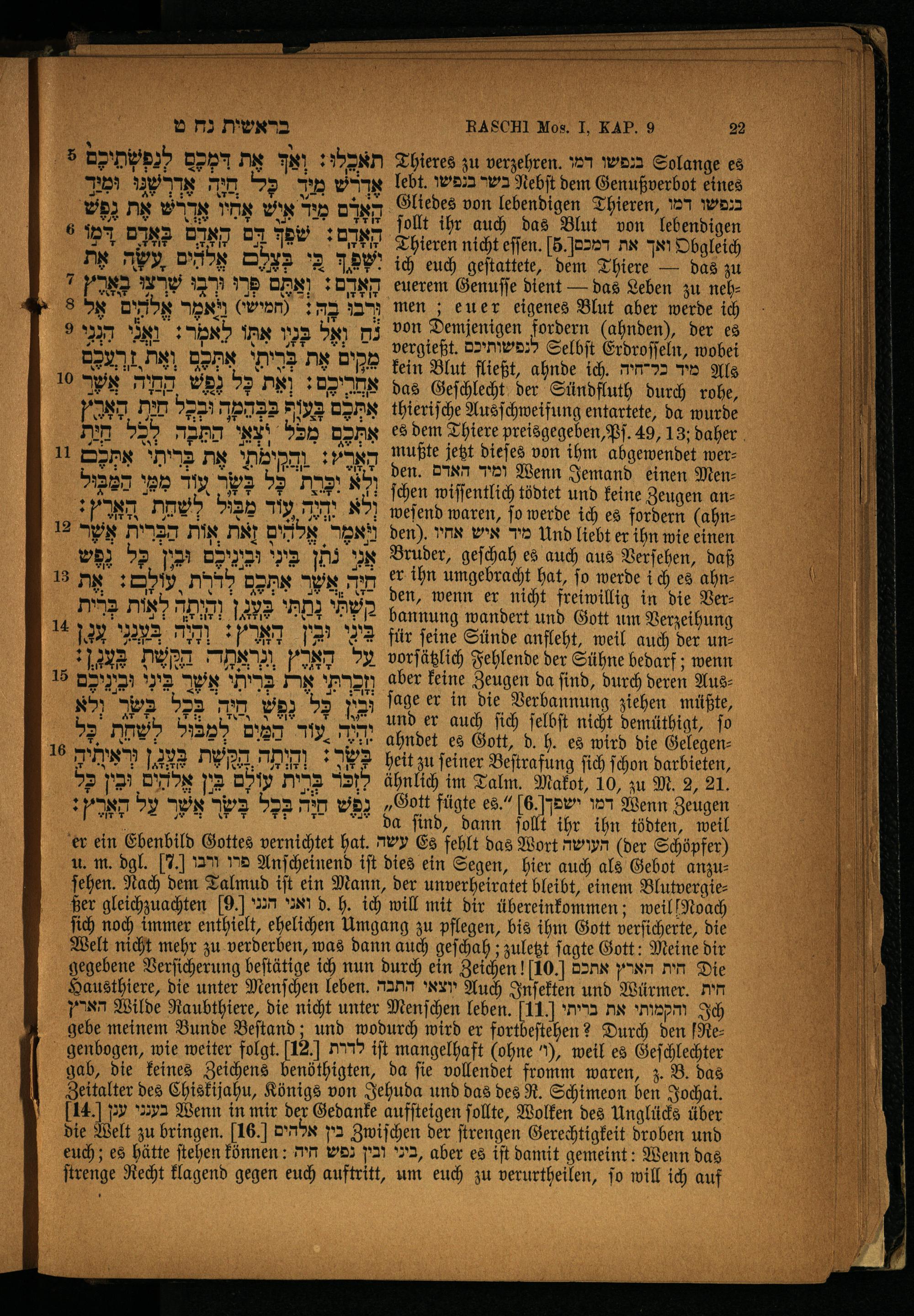 u. m. dgl. 7 פרד ורבו Anſcheinend iſt dies ein Segen, hier auch als Gebot anzu— ſehen. Nach dem Talmud iſt ein Mann, der unverheiratet bleibt, einem Blutvergießer gleichzuachten 9] ואגי הגני d. h, ich will mit dir übereinkommen; weil Noach ſich noch immer enthielt, ehelichen Umgang zu pflegen, bis ihm Gott verſicherte, die Welt nicht mehr zu verderben, was dann auch geſchah; zuletzt ſagte Gott: Meine dir gegebene Verſicherung beſtätige ich nun durch ein Zeichen![10.] חית הארץ אתכם Die Hausthiere, die unter Menſchen leben. יוצאי התכה Auch Inſekten und Würmer. חית än Wilde Raubthiere, die nicht unter Menſchen leben. 11] והקמותי את בריתי Ich gebe meinem Bunde Beſtand; und wodurch wird er fortbeſtehen? Durch den Regenbogen, wie weiter folgt. 12. לדרת iſt mangelhaft(ohne Y, weil es Geſchlechter gab, die keines Zeichens benöthigten, da ſie vollendet fromm waren, z. B. das Zeitalter des Chiskijahu, Königs von Jehuda und das des R. Schimeon ben Jochai. [14.] בענגי עכן Wenn in mir der Gedanke aufſteigen ſollte, Wolken des Unglücks über die Welt zu bringen. 16. אלהים fa Zwiſchen der ſtrengen Gerechtigkeit droben und euch; es hätte ſtehen können: ובין נפש היה ur, aber es iſt damit gemeint: Wenn das ſtrenge Recht klagend gegen euch auftritt, um euch zu verurtheilen, ſo will ich auf