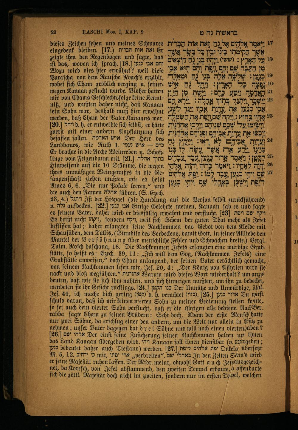 dieſes Zeichen ſehen und meines Schwures eingedenk bleiben. 17) זאת אות הברית Er zeigte ihm den Regenbogen und ſagte, das iſt das, wovon ich ſprach. 18. וחם אבי כנען Wozu wird dies hier erwähnt? weil dieſe Paraſcha von dem Rauſche Noach's erzählt, wobei ſich Cham gröblich verging u. ſeinetwegen Kanaan geflucht wurde. Bisher hatten wir von Chams Geſchlechtsfolge keine Kenntniß, und wußten daher nicht, daß Kanaan ſein Sohn war, deshalb muß hier erwähnt werden, daß Cham der Vater Kanaans war. 20] 7nd. h. er entweihte ſich ſelbſt, er hätte zuerſt mit einer andern Anpflanzung ſich befaſſen ſollen. wen איש Der Herr des Landbaues, wie Ruth 1. כרם— איש נעמי Er brachte in die Arche Weinreben n. Schößlinge vom Feigenbaum mit. 21. בתוך אהלה Hinweiſend auf die 10 Stämme, die wegen ihres unmäßigen Weingenußes in die Gefangenſchaft ziehen mußten, wie es heißt Amos 6, 6.„Die nur Pokale leeren,“ und die auch den Namen אהלה führen.(S. Ezech. 23,
