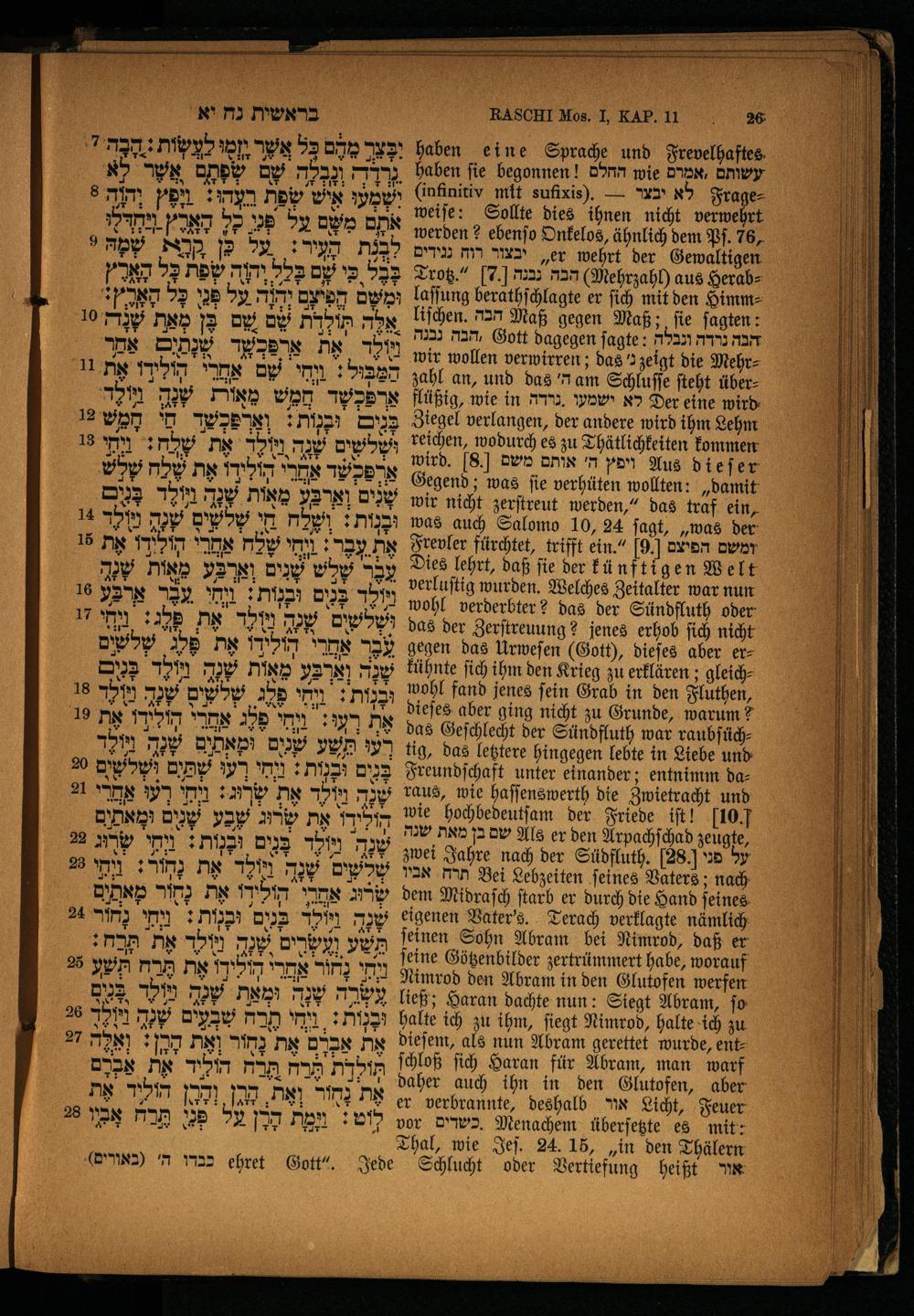 haben eine Sprache und Frevelhaftes haben fie begonnen! החלם wie עשותם ,אמרם (infinitiv mit sufixis)— לא יבצר Frageweiſe: Sollte dies ihnen nicht verwehrt werden? ebenſo Onkelos, ähnlich dem Pſ. 76, יבצור רוה נגידים„er wehrt der Gewaltigen Trotz.“]7.[ הבה נבגה(Mehrzahl) aus Herablaſſung berathſchlagte er ſich mit den Himmliſchen. הבה Maß gegen Maß; fie ſagten: ,הבה נבנה Gott dagegen ſagte: הבה נרדה ונבלה wir wollen verwirren; das נ' zeigt die Mehrzahl an, und das ה' am Schluffe ſteht überflüßig, wie in TMM. לא ישמעו Der eine wird Ziegel verlangen, der andere wird ihm Lehm reichen, wodurch es zu Thätlichkeiten kommen wird. S אותם משם n ויפץ Aus dieſer Gegend; was ſie verhüten wollten:„damit wir nicht zerſtreut werden,“ das traf ein, was auch Salomo 10, 24 ſagt,„was der Freyler fürchtet, trifft ein.“]9.[ זמשם הפיצם Dies lehrt, daß fie der künftigen Welt verluſtig wurden. Welches Zeitalter war nun wohl verderbter? das der Sündfluth oder das der Zerſtreuung? jenes erhob ſich nicht gegen das Urweſen(Gott), dieſes aber erkühnte ſich ihm den Krieg zu erklären; gleichwohl fand jenes ſein Grab in den Fluthen, dieſes aber ging nicht zu Grunde, warum? das Geſchlecht der Sündfluth war raubſüchtig, das letztere hingegen lebte in Liebe und Freundſchaft unter einander; entnimm da— raus, wie haſſenswerth die Zwietracht und wie hochbedeutſam der Friede iſt![10.7 שם בן מאת שנה Als er den Arpachſchad zeugte, zwei Jahre nach der Südfluth.[28.] על פני TAN man Bei Lebzeiten feines Vaters; nach dem Midraſch ſtarb er durch die Hand feines eigenen Vater'z. Terach verklagte nämlich ſeinen Sohn Abram bei Nimrod, daß er ſeine Götzenbilder zertrümmert habe, worauf Nimrod den Abram in den Glutofen werfen ließ; Haran dachte nun: Siegt Abram, ſo halte ich zu ihm, ſiegt Nimrod, halte ich zu dieſem, als nun Abram gerettet wurde, entſchloß ſich Haran für Abram, man warf daher auch ihn in den Glutofen, aber er verbrannte, deshalb Mx Licht, Feuer vor.כשדים Menachem überſetzte es mit: Thal, wie Jeſ. 24. 15,„in den Thälern
