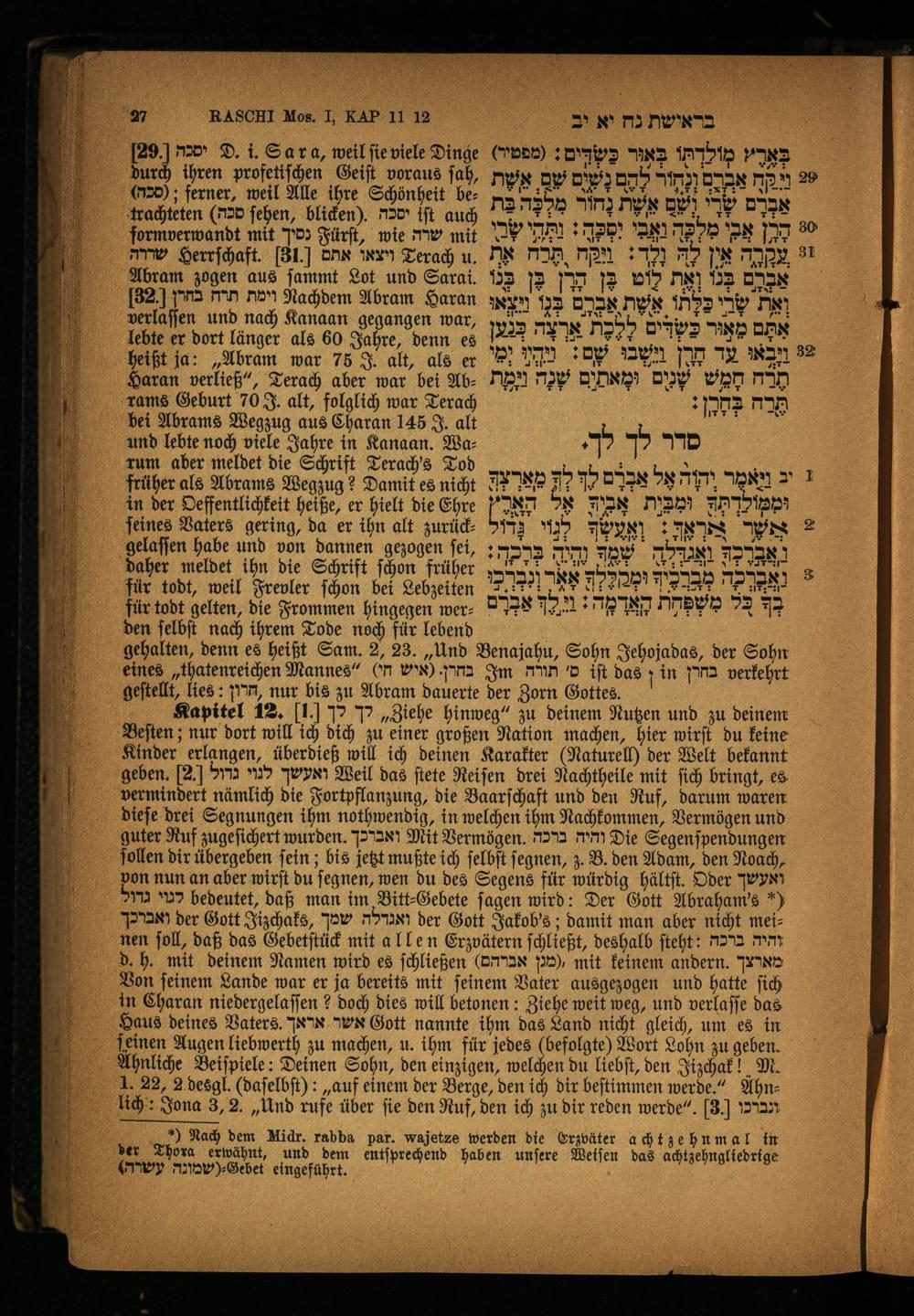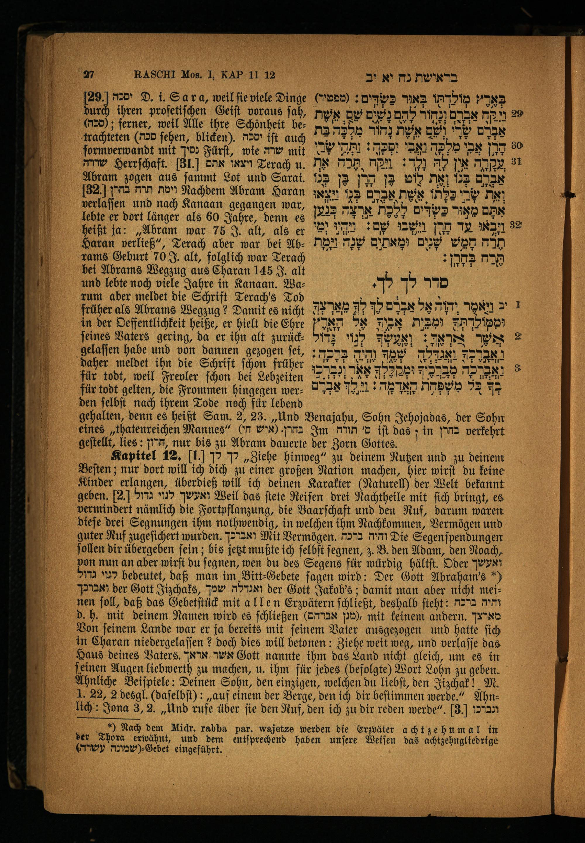 Kapitel 12. 1 לך לך„Ziehe hinweg“ zu deinem Nutzen und zu deinem Beſten; nur dort will ich dich zu einer großen Nation machen, hier wirft du keine Kinder erlangen, überdieß will ich deinen Karakter(Naturell) der Welt bekannt geben. 2 ואעשך לגוי גדול Weil das ſtete Reifen drei Nachtheile mit ſich bringt, es vermindert nämlich die Fortpflanzung, die Baarſchaft und den Ruf, darum waren dieſe drei Segnungen ihm nothwendig, in welchen ihm Nachkommen, Vermögen und guter Ruf zugeſichert wurden. ואברכך Mit Vermögen. ברכה mm Die Segenſpendungen ſollen dir übergeben fein; bis jetzt mußte ich ſelbſt ſegnen, z. B. den Adam, den Noach, pon nun an aber wirft du ſegnen, wen du des Segens für würdig hältſt. Oder ואעשך לגוי גדול bedeutet, daß man im Bitt-Gebete ſagen wird: Der Gott Abraham's*) ואברכך der Gott Jizchaks, ואגדלה שמך der Gott Jakob's; damit man aber nicht meinen ſoll, daß das Gebetſtück mit allen Erzvätern ſchließt, deshalb ſteht: והיה ברכה d. h. mit deinem Namen wird es ſchließen(מגן אברהם) mit keinem andern. מארצך Von ſeinem Lande war er ja bereits mit ſeinem Vater ausgezogen und hatte ſich in Charan niedergelaſſen? doch dies will betonen: Ziehe weit weg, und verlaſſe das Haus deines Vaters. אשר אראך Gott nannte ihm das Land nicht gleich, um es in ſeinen Augen liebwerth zu machen, u. ihm für jedes(befolgt) Wort Lohn zu geben. Ahnliche Beiſpiele: Deinen Sohn, den einzigen, welchen du liebſt, den Jizchak Ji. M.