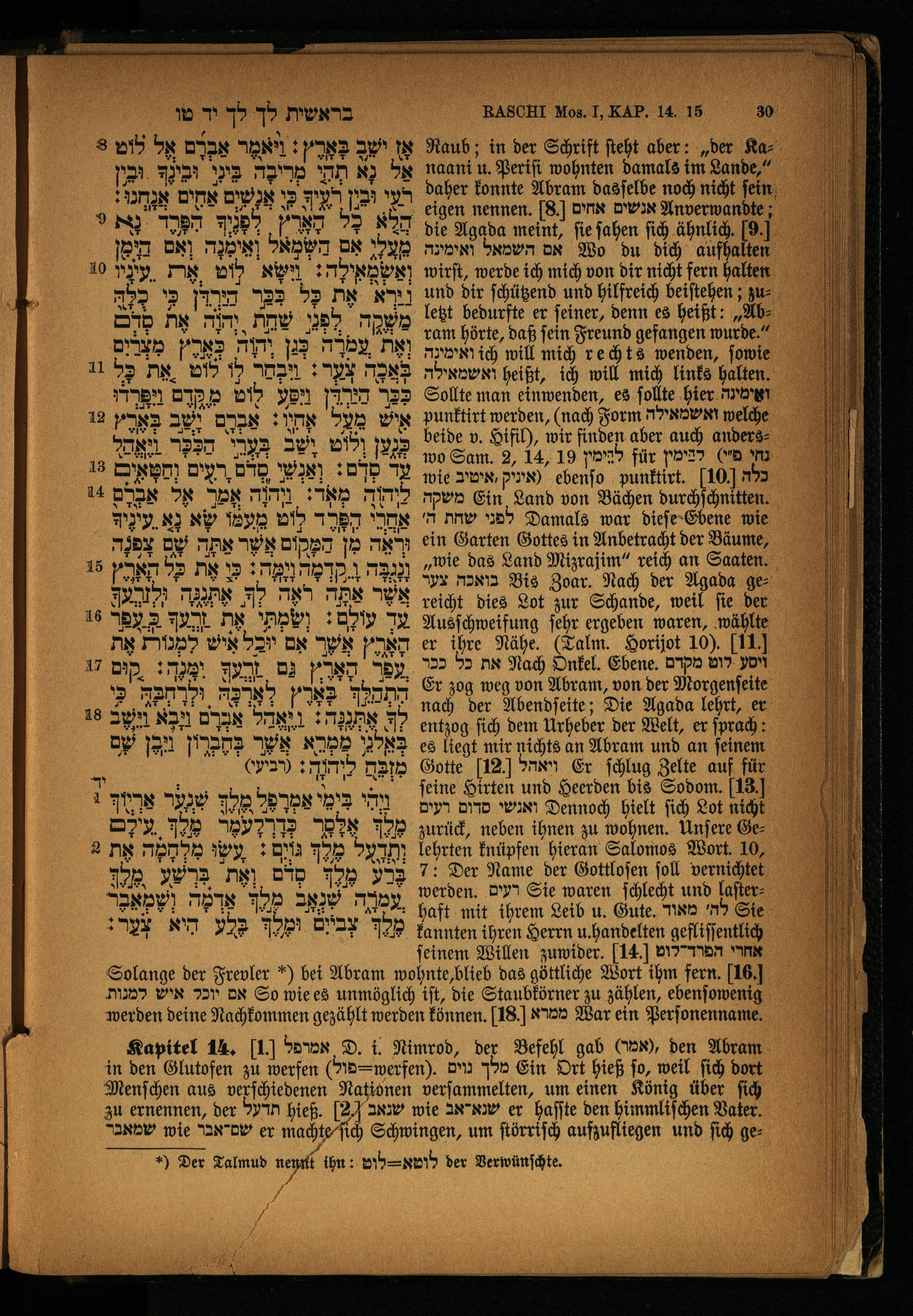 Kapitel 14. I] אמרפל D. i. Nimrod, der Befehl gab ,(אמר) den Abram in den Glutofen zu werfen(d= werfen). מלך נוים Ein Ort hieß fo, weil ſich dort Menſchen aus vexſchiedenen Nationen verſammelten, um einen König über ſich zu ernennen, der תדעל hieß. 2 שנאב wie שנאדאב er haſſte den himmliſchen Vater. שמאבר wie שם"אבר er machte ſich Schwingen, um ſtörriſch aufzufliegen und ſich ge: