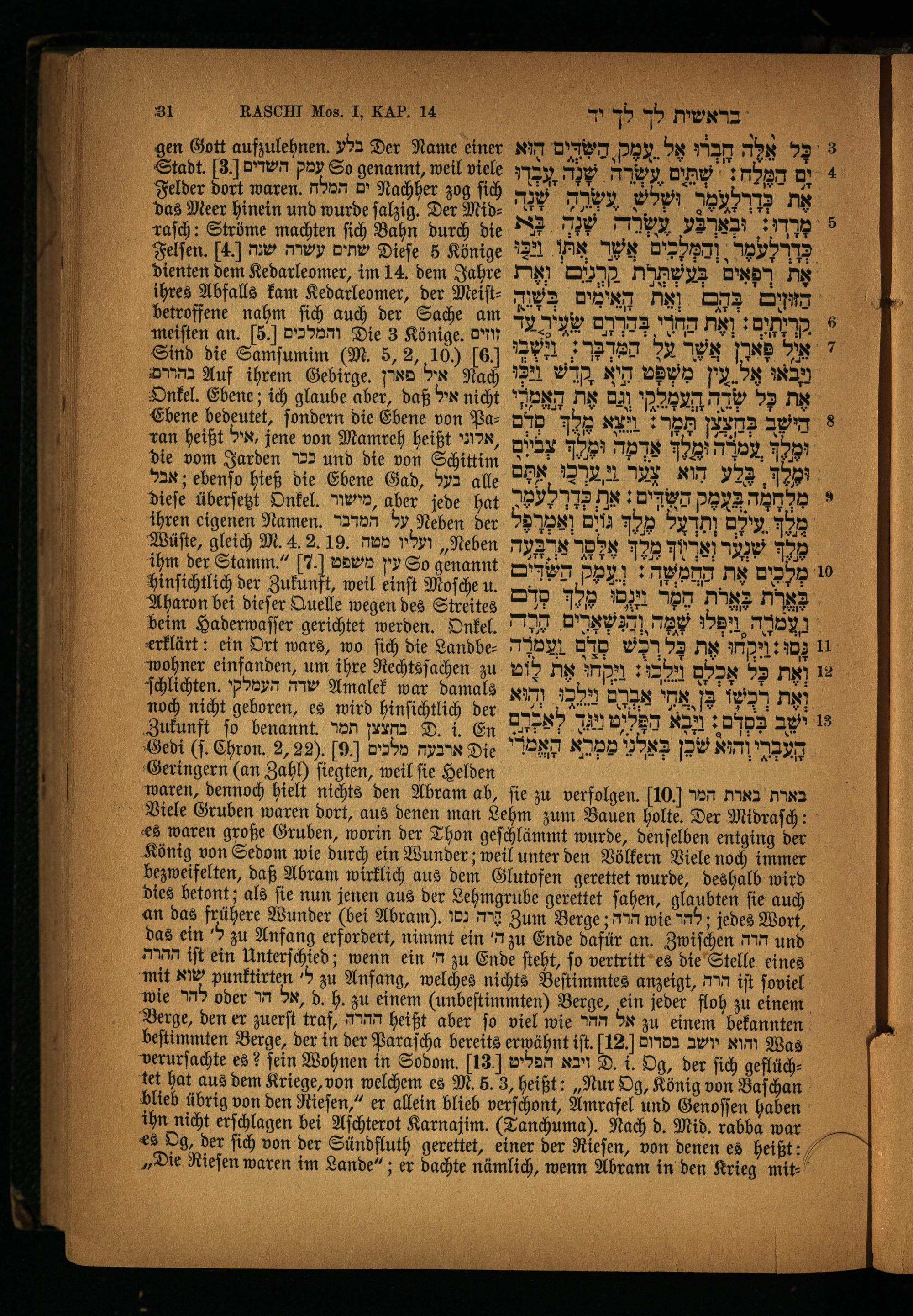 gen Gott aufzulehnen. בלע Der Name einer Stadt. 3. עמק השדים So genannt, weil viele Felder dort waren. ים המלה Nachher zog ſich das Meer hinein und wurde ſalzig. Der Midraſch: Ströme machten ſich Bahn durch die Felſen. 4 שתים עשרה שנה Dieſe 5 Könige dienten dem Kedarleomer, im 14. dem Jahre ihres Abfalls kam Kedarleomer, der Meiſtbetroffene nahm ſich auch der Sache am meiſten an. 5. והמלכים Die 3 Könige. זוזים Sind die Samſumim(M. 5, 2, 16) 6 בהררם: Auf ihrem Gebirge. איל פארן 8 Onkel. Ebene; ich glaube aber, daß איל Ebene bedeutet, ſondern die Ebene von Paran heißt ,איל jene von Mamreh(6101 ,אלוני die vom Jarden P und die von Schittim אבל; ebenfo hieß die Ebene Gad, בעל alle dieſe überſetzt Onkel. ren, aber jede hat ihren eigenen Namen. על המדבר Neben der Wüſte, gleich M. 4. 2. 19. ועליו מטה„Neben ihm der Stamm.“[7.] עין משפט So genannt hinſichtlich der Zukunft, weil einſt Moſche u. Aharon bei dieſer Quelle wegen des Streites beim Haderwaſſer gerichtet werden. Onkel. erklärt: ein Ort wars, wo ſich die Landbewohner einfanden, um ihre Rechtsſachen zu 110. שדה העמלקי Amalek war damals noch nicht geboren, es wird hinſichtlich der Zukunft fo benannt. בחצצן תמר D. 1. En Gedi)1. Chron. 2, 2). 9] ארבעה מלכים Die Geringern(an Zahh ſiegten, weil ſie Helden waren, dennoch hielt nichts den Abram ab,