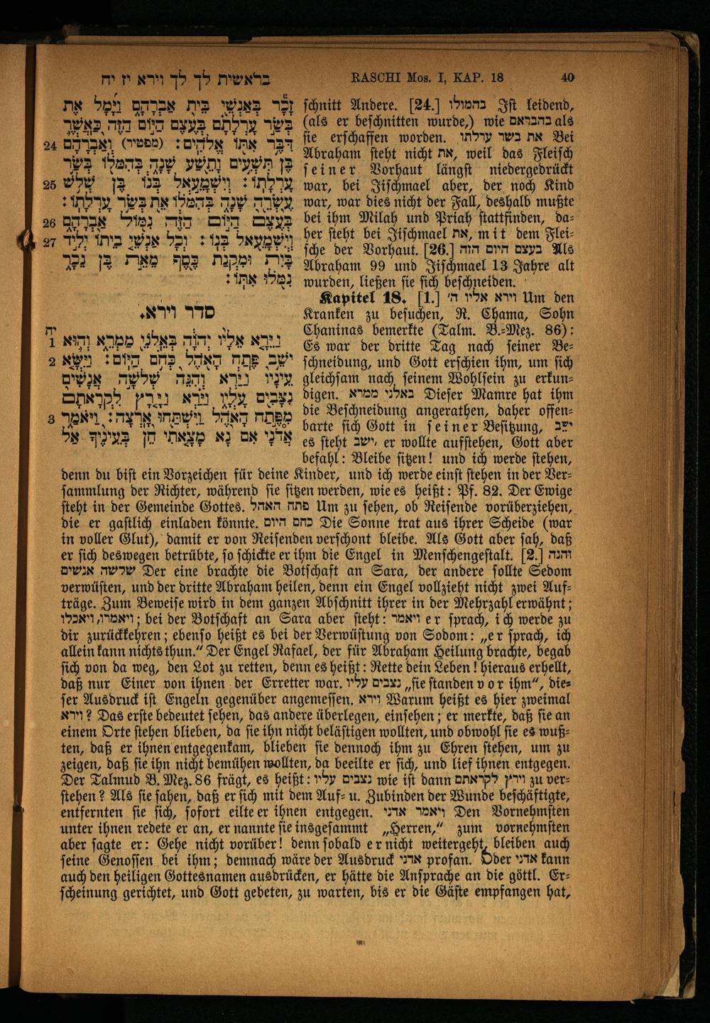 ſchnitt Andere. 24. בהמולו Iſt leidend, (als er beſchnitten wurde, wie בהבראם als fie erſchaffen worden. www את בשר Bei Abraham ſteht nicht ,את weil das Fleiſch ſeiner Vorhaut längſt niedergedrückt war, bei Jiſchmael aber, der noch Kind war, war dies nicht der Fall, deshalb mußte bei ihm Milah und Priah ſtattfinden, daher ſteht bei Jiſchmael ,את m it dem Fleije der Vorhaut. 26 בעצם היום הזה 5 Abraham 99 und Jiſchmael 13 Jahre alt wurden, ließen ſie ſich beſchneiden. Kapitel 18. 1 וירא אליו ה' Um den Kranken zu beſuchen, R. Chama, Sohn Chaninas bemerkte(Talm. B.⸗Mez. S6): Es war der dritte Tag nach ſeiner Beſchneidung, und Gott erſchien ihm, um ſich gleichſam nach feinem Wohlſein zu erkundigen. באלני ממרא Dieſer Mamre hat ihm die Beſchneidung angerathen, daher offenbarte ſich Gott in feiner Beſitzung, 2 es ſteht n er wollte aufſtehen, Gott aber