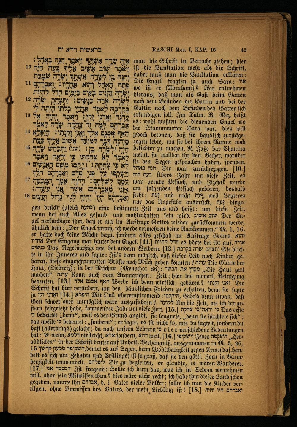 man die Schrift in Betracht ziehen; hier iſt die Punktation mehr als die Schrift, daher muß man die Punktation erklären: Die Engel fragten ja auch Sara: איו wo iſt er(Abraham)? Wir entnehmen hieraus, daß man als Gaſt beim Gatten nach dem Befinden der Gattin und bei der Gattin nach dem Befinden des Gatten ſich erkundigen ſoll. Im Talm. B. Mez. heißt es: wohl wußten die dienenden Engel wo die Stammmutter Sara war, dies will jedoch betonen, daß fie häuslich zurückgezogen lebte, um ſie bei ihrem Manne noch beliebter zu machen. R. Joße bar Chanina meint, ſie wollten ihr den Becher, worüber ſie den Segen geſprochen haben, ſpenden. הנה באהל Sie war zurückgezogen. 10. כעת חיה Übers Jahr um dieſe Zeit, es war gerade Peſſach, und Jizchak wurde am folgenden Peſſach geboren, deshalb 16001: כעת und nicht we, weil Letzteres nur das Ungefähr ausdrückt, ny; hinge