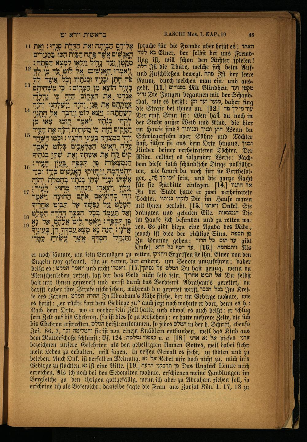 Engeln war geſandt, ihn zu retten, der andere, um Sedom umzukehren; daher heißt es: ויאמר. המלט und nicht.ויאמרו 17 bv) המלט על Du haft genug, wenn du Menſchenleben retteſt, laß dir das Geld nicht leid fein. אחריך van אל Du ſelbſt haſt mit ihnen gefrevelt und wirſt durch das Verdienſt Abraham's gerettet, du darfſt daher ihre Strafe nicht ſehen, während du gerettet wirft. הככר boa Im Kreiſe des Jarden. ההרה המלט In Abrahams Nähe fliehe, der im Gebirge wohnte, wie es heißt:„er rückte fort dem Gebirge zu“ auch jetzt noch wohnte er dort, denn es h.: Nach dem Orte, wo er vorher ſein Zelt hatte, und obwol es auch heißt: er ſchlug ſein Zelt auf bis Chebron,(ſo iſt dies ſo zu verſtehen): er hatte mehrere Zelte, die ſich bis Chebron erſtreckten. המלט heißt: entkommen, ſo jedes המלט in der h. Schrift, ebenſo Jeſ. 66, 7, והמליטה זכר fie iſt von einem Knäblein entbunden, weil das Kind aus dem Mutterſchoße ſchlüpft; Pſ. 124: כצפור נמלטה u. a. 18. אל נא אדני diefes אדני bezeichnen unſere Gelehrten als den geheiligten Namen Gottes, weil dabei ſteht: mein Leben zu erhalten, will ſagen, in deſſen Gewalt es ſteht, zu tödten und zu beleben. Auch Onk. iſt derſelben Meinung. אל כא Redet mir doch nicht zu, mich in's Gebirge zu flüchten. נא iſt eine Bitte. 19. פן תרבקני הרעה Das Unglück könnte mich erreichen. Als ich noch bei den Sedomiten wohnte, erſchienen meine Handlungen im Vergleiche zu den ihrigen gottgefällig, wenn ich aber zu Abraham ziehen ſoll, ſo erſcheine ich als Böſewicht; dasſelbe ſagte die Frau aus Zarfat Kön. 1. 17, 18 zu