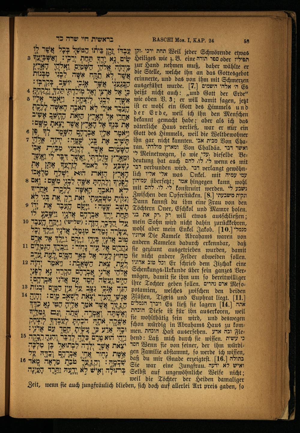 Weil jeder Schwörende etwas תחת ירכי.זקן תפיליז oder ספר תורה Heiliges wie z. B. eine zur Hand nehmen muß, daher wählte er die Stelle, welche ihn an das Gottesgebot erinnerte, und das von ihm mit Schmerzen n Es אלהי השמים]7 ausgeführt wurde. heißt nicht auch:„und Gott der Erde“ wie oben V. 3; er will damit ſagen, jetzt iſt er wohl ein Gott des Himmels und der Erde, weil ich ihn den Menſchen bekannt gemacht habe; aber als ich das väterliche Haus verließ, war er nur ein Gott des Himmels, weil die Weltbewohner Von Cha⸗ מבית אבי ihn gar nicht kannten. ואשר דבר Von Chaldäa. ומארץ מולדתי ran. dieſelbe Be⸗ ,עלי Meinetwegen, fo wie לי „h„h wenn es mit להם deutung hat auch verlangt gewöhn⸗ דבר verbunden wird. דבר עמי עמיה was Onkel. mit אלי אלו 10 überſetzt; Ms hingegen kann, wohl עמיהון נשבע לי konſtruirt werden. לי. לו. להם mit ונקית משבעתי.8 Zwiſchen den Opferſtücken. Dann kannſt du ihm eine Frau von den Töchtern Oner, Eſchkol und Mamre holen. will etwas ausſchließen; רק רק את בי mein Sohn wird nicht dahin zurückkehren, מנמלי).10 wohl aber mein Enkel Jakob. Die Kamele Abrahams waren von אדוניו andern Kamelen dadurch erkennbar, daß ſie gezäunt ausgetrieben wurden, damit ſie nicht andere Felder abweiden ſollen. Er ſchrieb dem Jizchak eine וכל טוב אדוניו Schenkungs⸗-Urkunde über fein ganzes Ver: mögen, damit fie ihm um fo bereitwilliger DIN Meſo— נהרים ihre Tochter geben ſollen. potamien, welches zwiſchen den beiden Flüßen, Tigris und Euphrat liegt. 11.) אתה].14[ ließ fie lagern 64 ויברך הגמלים Dieſe iſt für ihn auserkoren, weil הוכחת ſie wohlthätig ſein wird, und deswegen ſchon würdig in Abrahams Haus zu kom⸗ Fle⸗ ובה אדע Haft auserſehen. הוכחת men. hend: Laß mich durch fie wiſſen. ry w Wenn fie von feiner, der ihm würdi⸗ הסד gen Familie abſtammt, ſo werde ich wiſſen, בתולה.16 daß du mir Gnade erzeigteſt. ואיש לא ידעה Sie war eine Jungfrau. Selbſt auf ungewöhnliche Weiſe nicht; weil die Töchter der Heiden damaliger