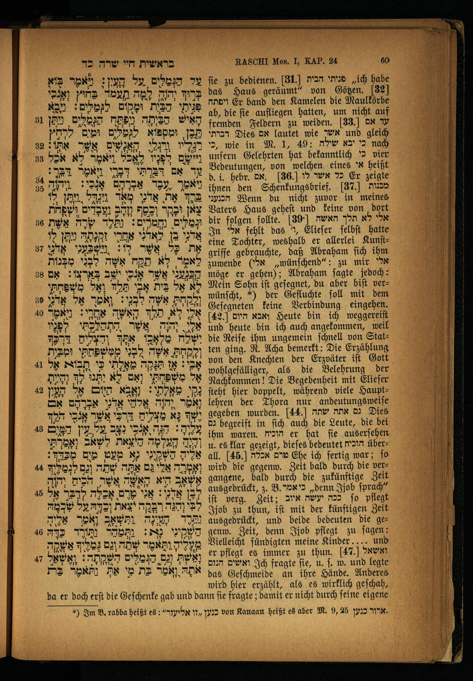 RASCHI Mos. I, KAP. 24 60 fie zu bedienen. 31] פניתי הבית„ich habe das Haus geräumt“ von Götzen. 32 ויפתח Er band den Kamelen die Maulkörbe ab, die ſie aufliegen hatten, um nicht auf fremden Feldern zu weiden. 33. עד אם דברתי Dies אם lautet wie אשר und gleich ,כי wie in M. 1, 49; יבא שילה* nach unſern Gelehrten hat bekanntlich 2 vier Bedeutungen, von welchen eines אי heißt d. i. hebr. Bx. 36 כל אשר לו Er zeigte ihnen den Schenkungsbrief. 37 מננות הכגעני Wenn du nicht zuvor in meines Vaters Haus geheſt und keine von dart dir folgen ſollte. 39 wn Pon אלי לא In אלי fehlt das n, Elieſer ſelbſt hatte eine Tochter, weshalb er allerlei Kunſtgriffe gebrauchte, daß Abraham ſich ihm zuwende(Dx„wünſchend: zu mir אלי möge er gehen); Abraham ſagte jedoch: Mein Sohn iſt geſegnet, du aber biſt verwünſcht,) der Gefluchte ſoll mit dem Geſegneten keine Verbindung eingehen. 42. ואבא היום Heute bin ich weggereiſt und heute bin ich auch angekommen, weil die Reiſe ihm ungemein ſchnell von Statten ging. R. Acha bemerkt: Die Erzählung von den Knechten der Erzväter iſt Gott wohlgefälliger, als die Belehrung der Nachkommen! Die Begebenheit mit Elieſer ſteht hier doppelt, während viele Hauptlehren der Thora nur andeutungsweiſe gegeben wurden. 44. גם אתה שתה 8 גם begreift in ſich auch die Leute, die bei ihm waren. הוכית er hat fie auserſehen u. es klar gezeigt, dieſes bedeutet הוכיח überall. 465. טרם אכלה Ehe ich fertig war; ſo wird die gegenw. Zeit bald durch die vergangene, bald durch die zukünftige Zeit ausgedrückt, z. B. Hör„denn Ijob ſprach“ iſt verg. Zeit; ככה יעשה אוב fo pflegt Ijob zu thun, iſt mit der künftigen Zeit ausgedrückt, und beide bedeuten die gegenw. Zeit, denn Ijob pflegt zu ſagen: Vielleicht ſündigten meine Kinder... und er pflegt es immer zu thun. 47 ואשאל ואשים הנזם Ich fragte fie, u. ſ. w. und legte das Geſchmeide an ihre Hände. Anderes wird hier erzählt, als es wirklich geſchah,