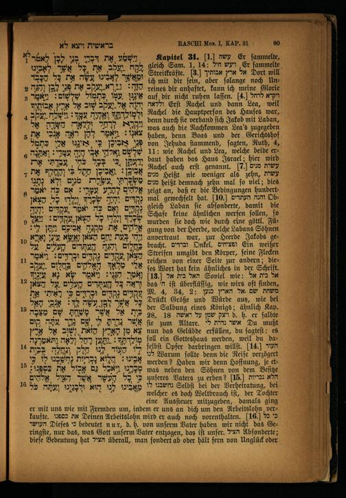 Kapitel 31. 1.) עשה Er ſammelte, gleich Sam. 1, 14: ויעש חיל Er ſammelte Streitkräfte. 3.) אל ארץ אבותיך Dort will ich mit dir ſein, aber ſolange noch Unreines dir anhaftet, kann ich meine Glorie auf dir nicht ruhen laſſen. 4. ויקרא לרחל וללאה Erſt Rachel und dann Lea, weil Rachel die Hauptperſon des Hauſes war, denn durch ſie verband ſich Jakob mit Laban, was auch die Nachkommen Lea's zugegeben haben, denn Boas und der Gerichtshof von Jehuda ſtammend, ſagten, Ruth, 4, 11: wie Rachel und Lea, welche beide erbaut haben das Haus Israel; hier wird Rachel auch erſt genannt. 7. עשרת מנים מנים Heißt nie weniger als zehn, עשרת מנים heißt demnach zehn mal ſo viel; dies zeigt an, daß er die Bedingungen hundertmal gewechſelt hat. 10) והנה העתדים Dbgleich Laban ſie abſonderte, damit die Schafe keine ähnlichen werfen ſollen, ſo wurden fie doch wie durch eine göttl. Fügung von der Heerde, welche Labans Söhnen anvertraut war, zur Heerde Jakobs gebracht. וברדים Onkel. ופציחים Ein weißer Streifen umgibt den Körper, ſeine Flecken reichen von einer Seite zur andern; dieſes Wort hat kein ähnliches in der Schriſt. 13. האל בית אל Soviel wie: אל Ma אל das ה' iſt überflüſſig, wie wirs oft finden, M. 4, 34, 2: משחת שם.אל הארץ כנען Drückt Größe und Würde aus, wie bei der Salbung eines Königs; ähnlich Kap. 28, 18 ויצק שמן על ראשה d. h. er ſalbte fie zum 904016. אשר נדרת לי Du mußt nun das Gelübde erfüllen, du ſagteſt: es ſoll ein Gotteshaus werden, weil du daſelbſt Opfer darbringen willſt. 14 העוד לכו Warum ſollte denn die Reiſe verzögert werden? Haben wir denn Hoffnung, je etwas neben den Söhnen von dem Beſitze unſeres Vaters zu erben? 15 הלא נכריות נחשבנו לו Selbſt bei der Verheiratung, bei welcher es doch Weltbrauch iſt, der Tochter eine Ausſteuer mitzugeben, damals ging