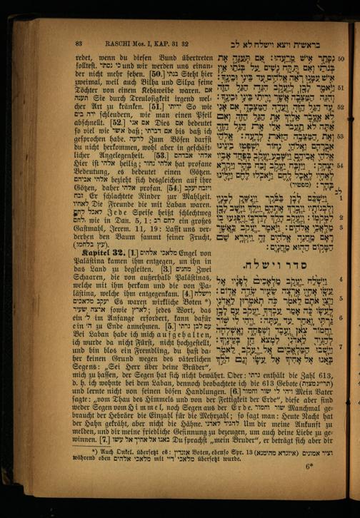 Kapitel 32. 1] מלאכי אלהים Engel von Paläſtina kamen ihm entgegen, un ihn in das Land zu begleiten. 3 dun Zwei Schaaren, die von außerhalb Paläſtinas, welche mit ihm herkam und die von Ra: läſtina, welche ihm entgegenkam. 4. וישלח יעקב מלאכים Es waren wirkliche Boten*) לארץ 6 ארצה שעיר; jedes Wort, 8 ein? im Anfange erfordert, kann dafür ein 9 zu Ende annehmen.[5.] לבן גרתי pp Bei Laban habe ich mich aufgehalten, ich wurde da nicht Fürſt, nicht hochgeſtellt, und bin blos ein Fremdling, du haft daher keinen Grund wegen des väterlichen Segens:„Sei Herr über deine Brüder“,