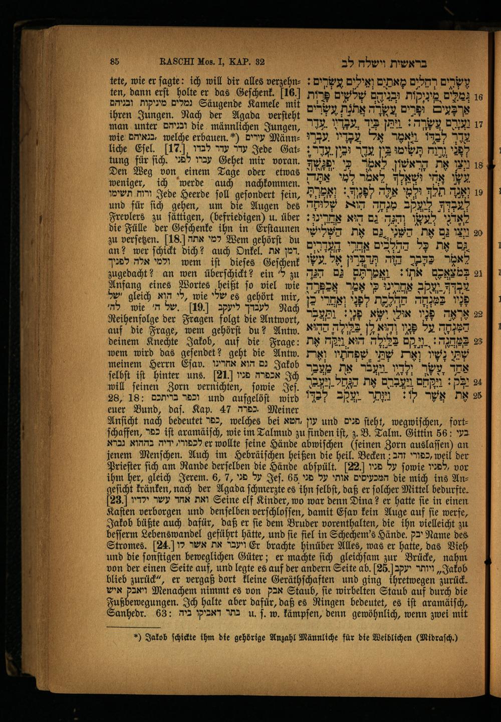 Anſicht nach bedeutet ,כפר welches bei NUM, עון und den ſteht, wegwiſchen, fortſchaffen, 755. iſt aramäiſch, wie im Talmud zu finden iſt, z. B. Talm. Gittin 56: בעי לכפורי, יריה בההוא גברא er wollte feine Hände abwiſchen(feinen Zorn auslaſſen) an jenem Menſchen. Auch im Hebräiſchen heißen die heil. Becken: 2 rx, weil der Prieſter ſich am Rande derſelben die Hände abſpült. 22. על פניו ſowie 7b, vor ihm her, gleich Jerem. 6, 7, על פני Jeſ. 65 המכעיסים אותי על פני die mich ins Angeſicht kränken, nach der Agada ſchmerzte es ihn ſelbſt, daß er ſolcher Mittel bedurfte. 23. ואת אחד עשר ילדיו Seine elf Kinder, wo war denn Dina? er hatte fie in einen Kaſten verborgen und denſelben verſchlofſen, damit Eſav kein Auge auf fie werfe, Jakob büßte auch dafür, daß er ſie dem Bruder vorenthalten, die ihn vielleicht zu beſſerm Lebenswandel geführt hätte, und fie fiel in Schechem's Hände. יבק Name des Stromes. 24. ויעבר את אשר לו Er brachte hinüber Alles, was er hatte, das Vieh und die ſonſtigen beweglichen Güter; er machte ſich gleichſam zur Brücke, nahm von der einen Seite auf, und legte es auf der andern Seite ab. 25. ויותר יעקב ,0 blieb zurück“, er vergaß dort kleine Geräthſchaften und ging ihretwegen zurück. ויאבק איש Menachem nimmt es von Fax Staub, fie wirbelten Staub auf durch die J nnn n. Ich halte aber dafür, daß es Ringen bedeutet, es iſt aramäiſch, Sanhedr. 63: בתר דאביקו ביה u. ſ. w. kämpſen, denn gewöhnlich, wenn zwei mit
