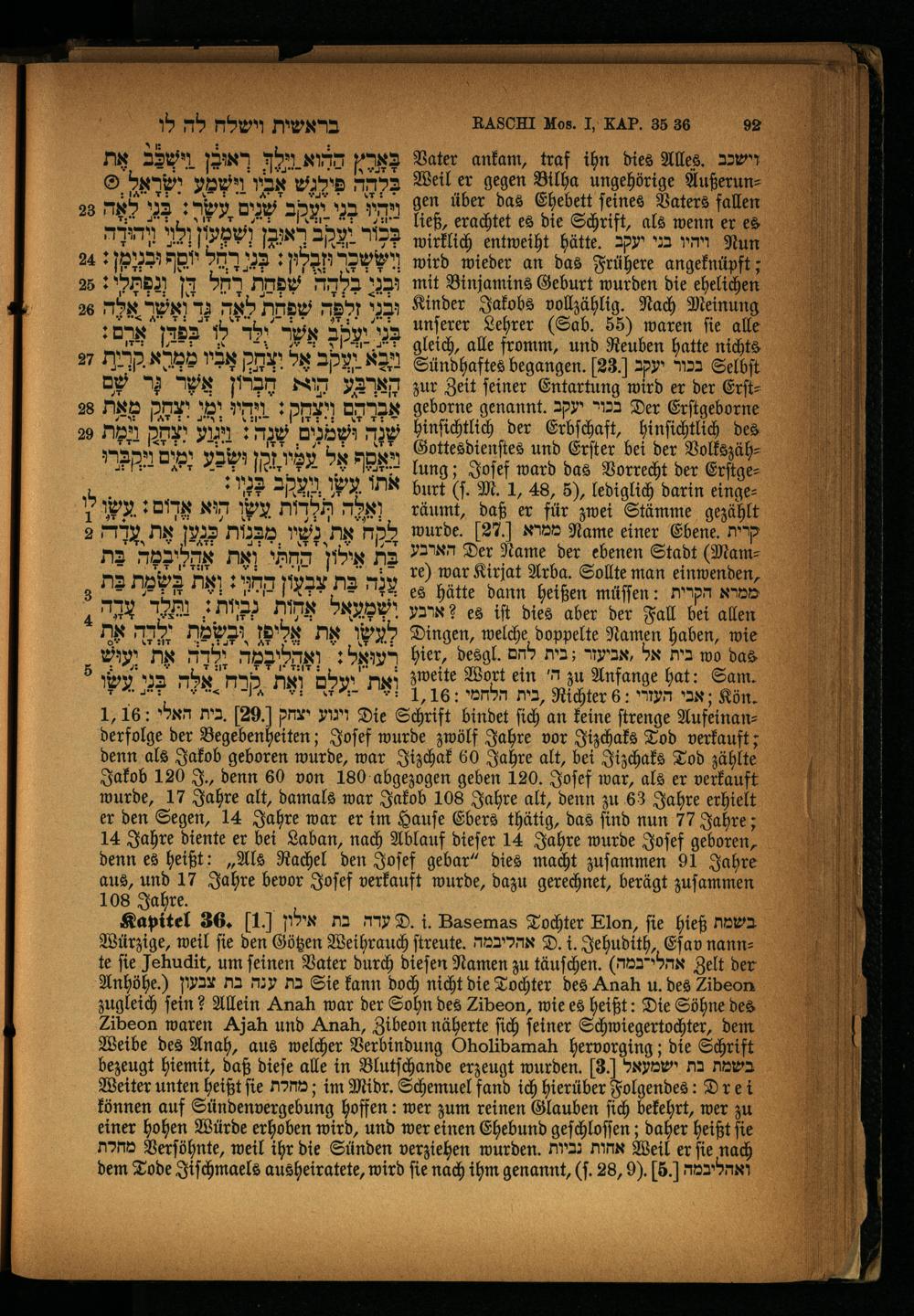 Kapitel 36. 1 עדה בת אילון D. i. Basemas Tochter Elon, fie hieß בשמת Würzige, weil fie den Götzen Weihrauch ſtreute. אהליבמה D. i. Jehudith, Efav nannte fie Jehudit, um ſeinen Vater durch dieſen Namen zu täuſchen. אהלידבמה) Belt der Anhöhe.) בת ענה בת צבעון Sie kann doch nicht die Tochter des Anah u. des Zibeon zugleich ſein? Allein Anah war der Sohn des Zibeon, wie es heißt: Die Söhne des Zibeon waren Ajah und Anah, Zibeon näherte ſich feiner Schwiegertochter, dem Weibe des Anah, aus welcher Verbindung Oholibamah hervorging; die Schrift bezeugt hiemit, daß dieſe alle in Blutſchande erzeugt wurden. 3. בשמת בת ישמעאל Weiter unten heißt fie מחלת; im Midr. Schemuel fand ich hierüber Folgendes: Drei können auf Sündenvergebung hoffen: wer zum reinen Glauben ſich bekehrt, wer zu einer hohen Würde erhoben wird, und wer einen Ehebund geſchloſſen; daher heißt ſie מחלת Verſöhnte, weil ihr die Sünden verziehen wurden. wa; אחות Weil er fie nach dem Tode Jiſchmaels ausheiratete, wird fie nach ihm genannt,(ſ. 28, M.[5.] ואהליבמה