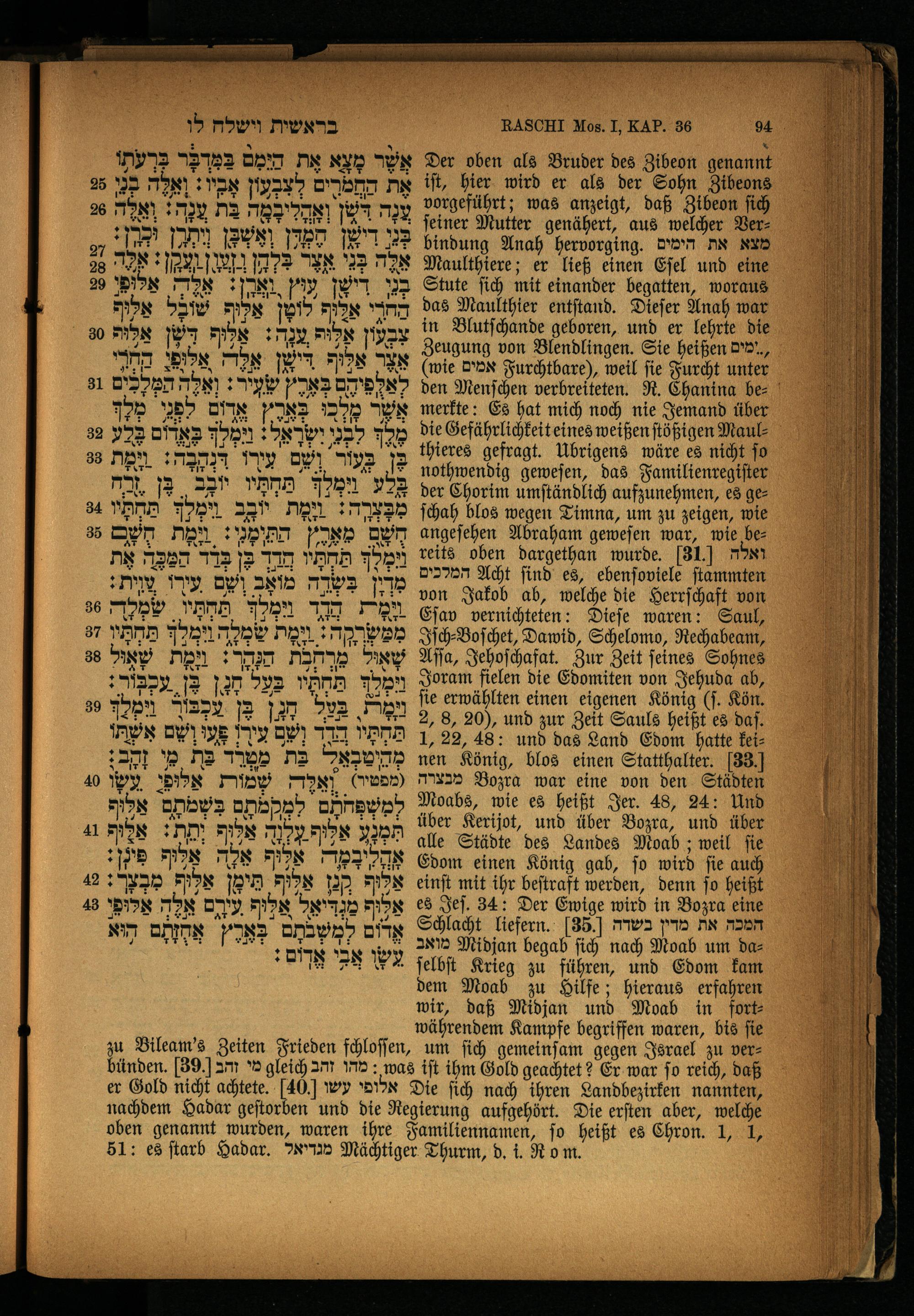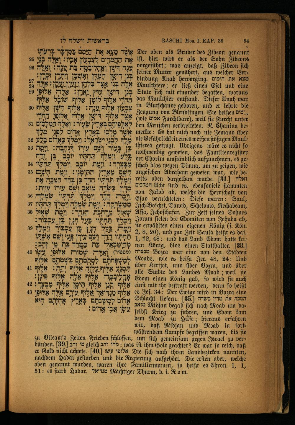 Der oben als Bruder des Zibeon genannt iſt, hier wird er als der Sohn Zibeons vorgeführt; was anzeigt, daß Zibeon ſich ſeiner Mutter genähert, aus welcher Verbindung Anah hervorging. מצא את הימים Maulthiere; er ließ einen Eſel und eine Stute ſich mit einander begatten, woraus das Maulthier entſtand. Dieſer Anah war in Blutſchande geboren, und er lehrte die Zeugung von Blendlingen. Sie heißen drr, (wie אמים Furchtbare), weil fie Furcht unter den Menſchen verbreiteten. R. Ehanina bemerkte: Es hat mich noch nie Jemand über die Gefährlichkeit eines weißen ſtößigen Maulthieres gefragt. Ubrigens wäre es nicht ſo nothwendig geweſen, das Familienregiſter der Chorim umſtändlich aufzunehmen, es geſchah blos wegen Timna, um zu zeigen, wie angeſehen Abraham geweſen war, wie bereis oben dargethan wurde. 31) ואלה המלכים Acht find es, ebenſoviele ſtammten von Jakob ab, welche die Herrſchaft von Eſay vernichteten: Dieſe waren: Saul, Iſch⸗Boſchet, Dawid, Schelomo, Rechabeam, Aſſa, Jehoſchafat. Zur Zeit feines Sohnes Joram fielen die Edomiten von Jehuda ab, ſie erwählten einen eigenen König(ſ. Kön. 2, 8, 20), und zur Zeit Sauls heißt es daſ. 1, 22, 48: und das Land Edom hatte keinen König, blos einen Statthalter. 33. מבצרה Bozra war eine von den Städten Moabs, wie es heißt Jer. 48, 24: Und über Kerijot, und über Bozra, und über alle Städte des Landes Moab; weil ſie Edom einen König gab, ſo wird ſie auch einſt mit ihr beſtraft werden, denn ſo heißt es Jeſ. 34: Der Ewige wird in Bozra eine Schlacht liefern. 35 המכה את מדין בשדה מואב Midjan begab ſich nach Moab um daſelbſt Krieg zu führen, und Edom kam dem Moab zu Hilfe; hieraus erfahren wir, daß Midjan und Moab in ſortwährendem Kampfe begriffen waren, bis ſie