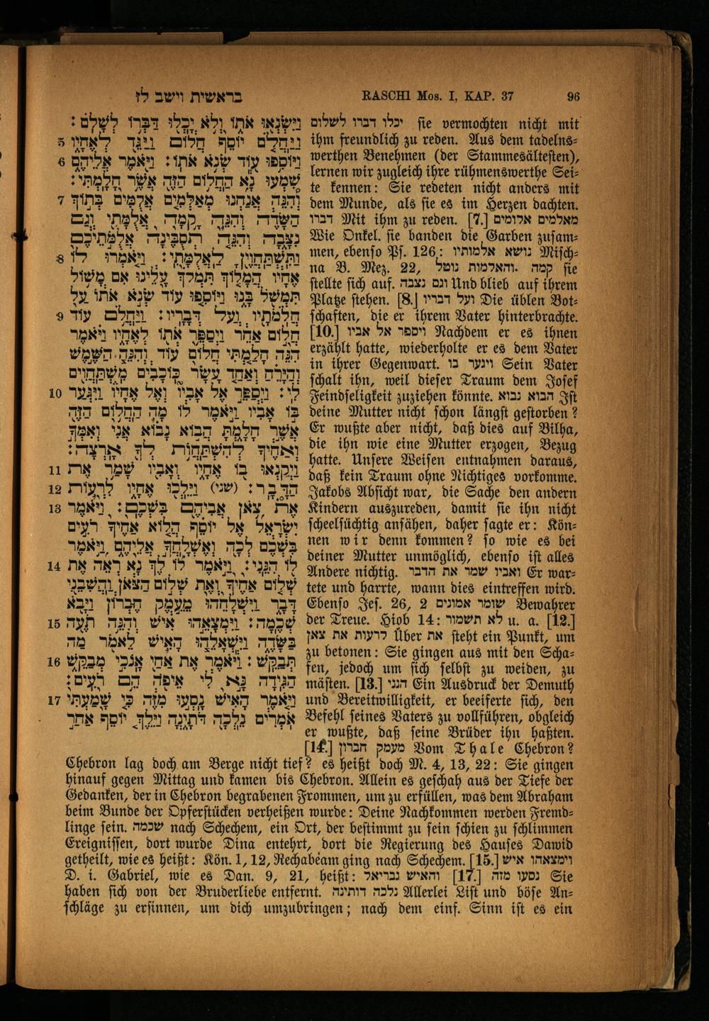 ihm freundlich zu reden. Aus dem tadelnswerthen Benehmen(der Stammegälteſten), lernen wir zugleich ihre rühmenswerthe Seite kennen: Sie redeten nicht anders mit dem Munde, als ſie es im Herzen dachten. דברו Mit ihm zu reden. 7. מאלמים אלומים Wie Onkel. ſie banden die Garben zuſammen, ebenſo Pf. 126: נושא אלמותיו Miſch= na B. Mez. 22, 204.האלמות An fie ſtellte ſich auf. וגם נצבה Und blieb auf ihrem Platze ſtehen. S] ועל דבריו Die üblen Botſchaften, die er ihrem Vater hinterbrachte. ]10.[ ויספר אל אביו Nachdem er es ihnen erzählt hatte, wiederholte er es dem Vater in ihrer Gegenwart. 3 וינער Sein Vater ſchalt ihn, weil dieſer Traum dem Joſef Feindſeligkeit zuziehen könnte. הבוא נבוא Iſt deine Mutter nicht ſchon längſt geſtorben? Er wußte aber nicht, daß dies auf Bilha, die ihn wie eine Mutter erzogen, Bezug hatte. Unſere Weiſen entnahmen daraus, daß kein Traum ohne Nichtiges vorkomme. Jakobs Abſicht war, die Sache den andern Kindern auszureden, damit ſie ihn nicht ſcheelſüchtig anſähen, daher ſagte er: Können wir denn kommen? ſo wie es bei deiner Mutter unmöglich, ebenſo iſt alles Andere nichtig. IM שמר את wax) Er war: tete und harrte, wann dies eintreffen wird. Ebenſo Jeſ. 26, 2 שומר אמונים der Treue. Hiob 14: לא תשמור u. a. iz. לרעות את צאן Über את ſteht ein Punkt, um zu betonen: Sie gingen aus mit den Schafen, jedoch um ſich ſelbſt zu weiden, zu mäſten.[13.] הגני Ein Ausdruck der Demuth und Bereitwilligkeit, er beeiferte ſich, den Befehl ſeines Vaters zu vollführen, obgleich er wußte, daß ſeine Brüder ihn haßten. 16] am מעמק Vom Thale Chebron?
