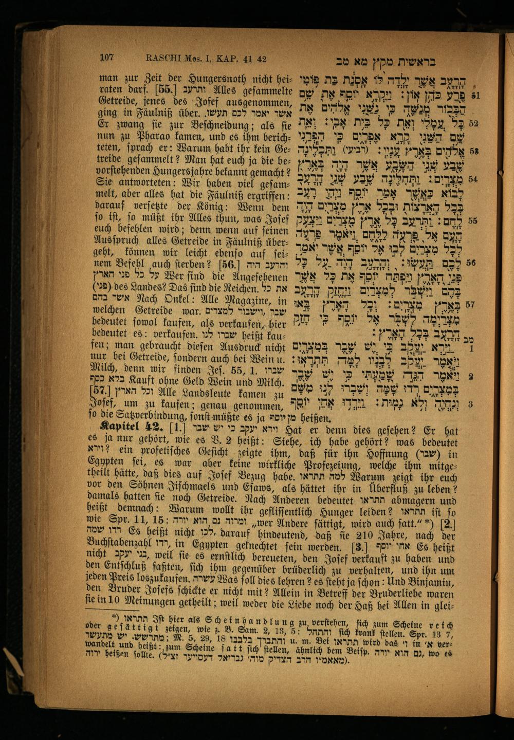 man zur Zeit der Hungersnoth nicht hei: raten darf. 55. ותרעב Alles geſammelte Getreide, jenes des Jofef ausgenommen, ging in Fäulniß über. אשר יאמר לכם תעשו. Er zwang ſie zur Beſchneidung; als ſie nun zu Pharao kamen, und es ihm berichteten, ſprach er: Warum habt ihr kein Getreide geſammelt? Man hat euch ja die bevorſtehenden Hungers jahre bekannt gemacht? Sie antworteten: Wir haben viel geſam— melt, aber alles hat die Fäulniß ergriffen: darauf verſetzte der König: Wenn dem ſo iſt, ſo müßt ihr Alles thun, was Joſef euch befehlen wird; denn wenn auf ſeinen Ausſpruch alles Getreide in Fäulniß übergeht, können wir leicht ebenſo auf ſei— nem Befehl auch ſterben?[56.] והרעב היה על כל פני הארץ Wer ſind die Angefehenen (פני) des Landes? Das find die Reichen. את כל dn אשר Nach Onkel: Alle Magazine, in welchen Getreide war. שבר ,וישבור למצרים bedeutet ſowol kaufen, als verkaufen, hier bedeutet es: verkaufen. שברו לגו heißt kau— fen; man gebraucht dieſen Ausdruck nicht nur bei Getreide, ſondern auch bei Wein u. Milch, denn wir finden Jeſ. 55, 1. שברו בלא כסף Kauft ohne Geld Wein und Milch. [5%] וכל הארץ Alle Landsleute kamen zu Joſef, um zu kaufen; genau genommen,