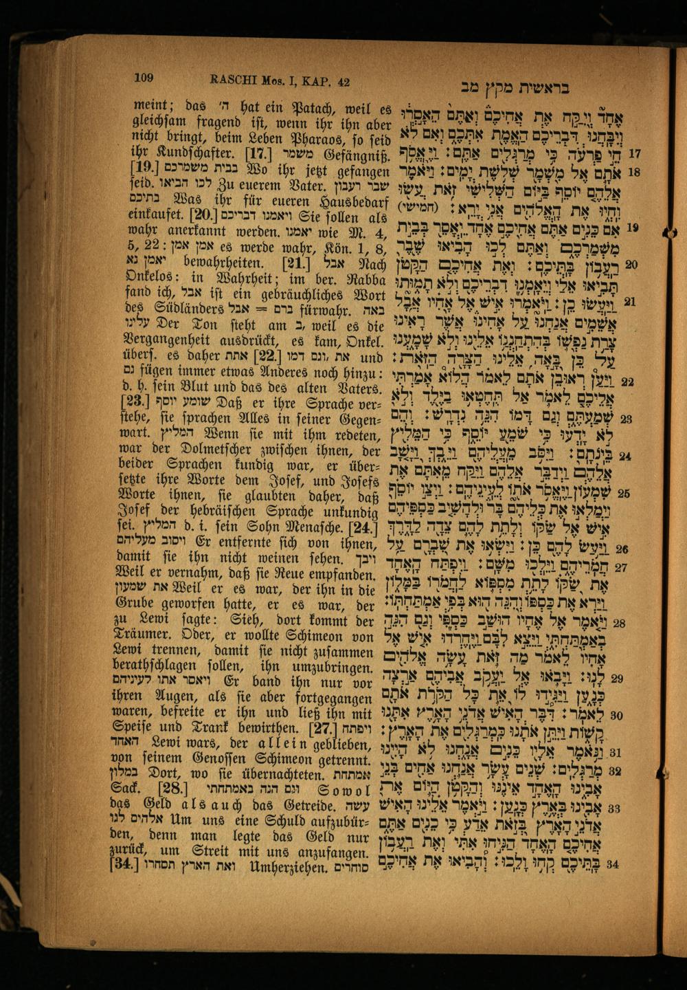 des Südländers ברם= אבל fürwahr. באה עליו Der Ton ſteht am* weil es die Vergangenheit ausdrückt, es kam, Onkel. überſ. es daher את ,ונס דמו]22 אתת und גם fügen immer etwas Anderes noch hinzu: d. h. fein Blut und das des alten Vaters. 23] שומע יוסף Daß er ihre Sprache טסט ſtehe, ſie ſprachen Alles in ſeiner Gegenwart. המליץ Wenn fie mit ihm redeten, war der Dolmetſcher zwiſchen ihnen, der beider Sprachen kundig war, er überſetzte ihre Worte dem Joſef, und Joſefs Worte ihnen, ſie glaubten daher, daß Joſef der hebräiſchen Sprache unkundig ſei המליץ d. i. fein Sohn Menaſche. 24. ויסוב מעליהם Er entfernte ſich von ihnen, damit ſie ihn nicht weinen ſehen.** Weil er vernahm, daß ſie Reue empfanden. את שמעון Weil er es war, der ihn in die Grube geworfen hatte, er es war, der zu Lewi ſagte: Sieh, dort kommt der Träumer. Oder, er wollte Schimeon von Lewi trennen, damit ſie nicht zuſammen berathſchlagen ſollen, ihn umzubringen. ויאסר אתו לעיניהם Er band ihn nur vor ihren Augen, als ſie aber fortgegangen waren, befreite er ihn und ließ ihn mit Speiſe und Trank bewirthen. ö ויפתח האחר Lewi wars, der allein geblieben, von feinem Genoſſen Schimeon getrennt. במלון Dort, wo fie übernachteten. אמתחת Sack.[28.]| הנה באמתחתי sn Sowol das Geld als auch das Getreide. עשה אלהים לגו Um uns eine Schuld aufzubürden, denn man legte das Geld nur zurück, um Streit mit uns anzufangen. 134] ואת הארץ תסחרו Umherziehen. סוחרים