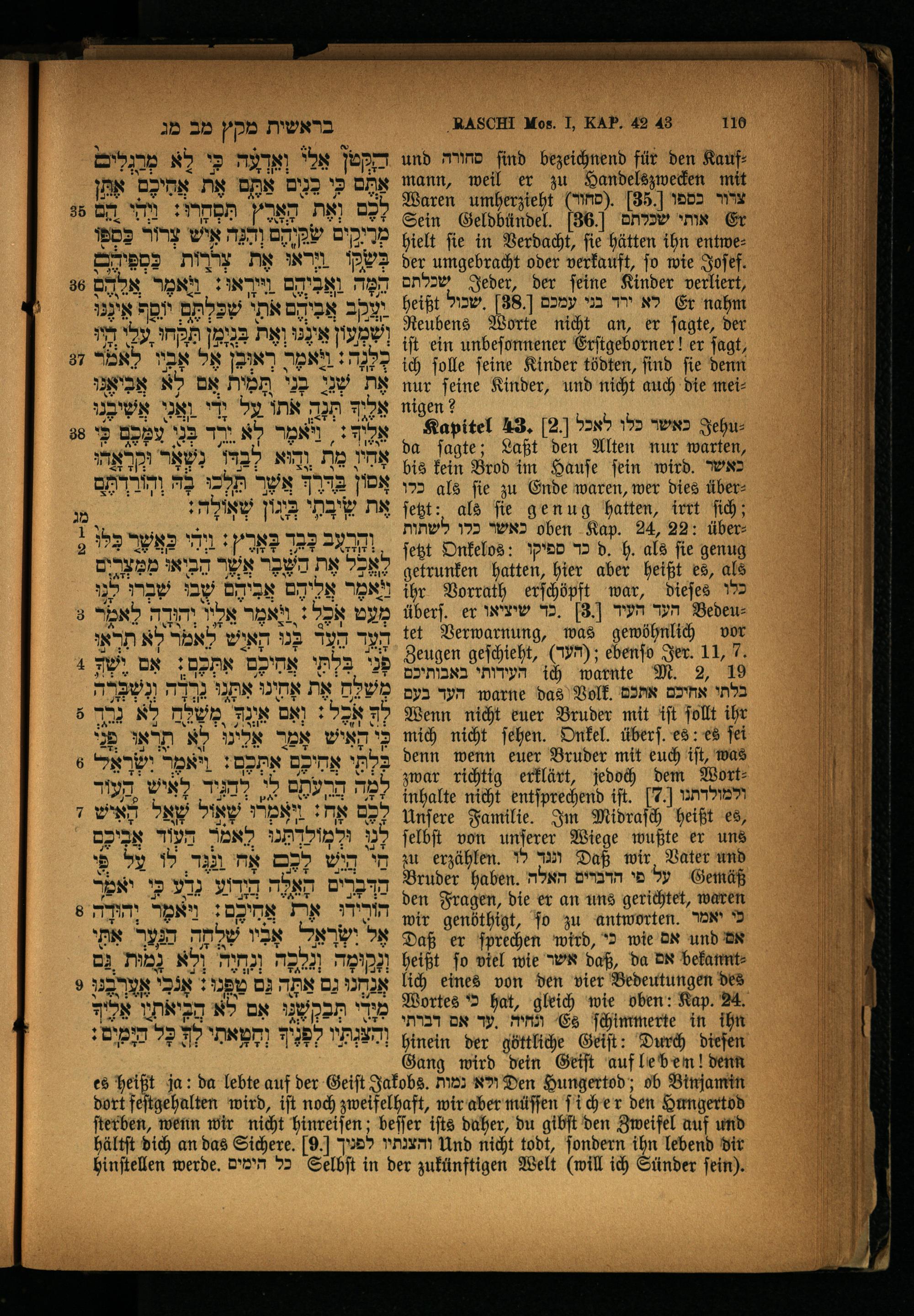 und rd find bezeichnend für den Kauf: mann, weil er zu Handelszwecken mit Waren umherzieht(MD). 35. צרור כספו Sein Geldbündel. 36 אותי שכלתם Er hielt ſie in Verdacht, ſie hätten ihn entweder umgebracht oder verkauft, ſo wie Joſef. שכלתם Jeder, der feine Kinder verliert, heißt לא ירד בני עמכם.38.שכול Er nahm Reubens Worte nicht an, er ſagte, der iſt ein unbeſonnener Erſtgeborner! er ſagt, ich ſolle ſeine Kinder tödten, ſind ſie denn nur ſeine Kinder, und nicht auch die meinigen?