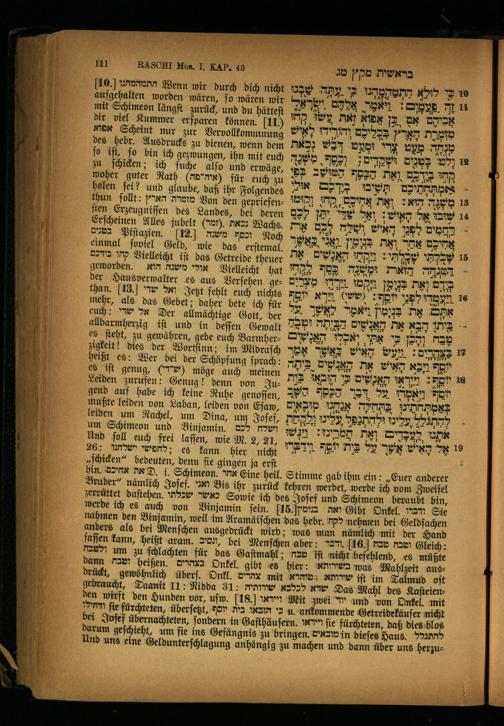 ]10.[ התמהמהנו Wenn wir durch dich nicht aufgehalten worden wären, ſo wären wir mit Schimeon längſt zurück, und du hätteſt dir viel Kummer erſparen können. 115 אפוא Scheint nur zur Vervollkommnung des hebr. Ausdrucks zu dienen, wenn dem ſo iſt, ſo bin ich gezwungen, ihn mit euch zu ſchicken; ich fuche alſo und erwäge, woher guter Rath(איהדפה) für euch zu holen ſei? und glaube, daß ihr Folgendes thun ſollt: xn מזמרת Von den geprieſenſten Erzeugniſſen des Landes, bei deren Erſcheinen Alles jubelt(97). נכאת Wachs. 5502 Piſtazien. 12. משנה 521 Noch einmal ſoviel Geld, wie das erſtemal. קחו בידכם Vielleicht iſt das Getreide theuer geworden. אולי משגה הוא Vielleicht hat der Hausverwalter es aus Verſehen gethan.[13.] ואל שדי Jetzt fehlt euch nichts mehr, als das Gebet; daher bete ich für euch: שדי x Der allmächtige Gott, der allbarmherzig iſt und in deſſen Gewalt es ſteht, zu gewähren, gebe euch Barmherzigkeit! dies der Wortfinn; im Midraſch