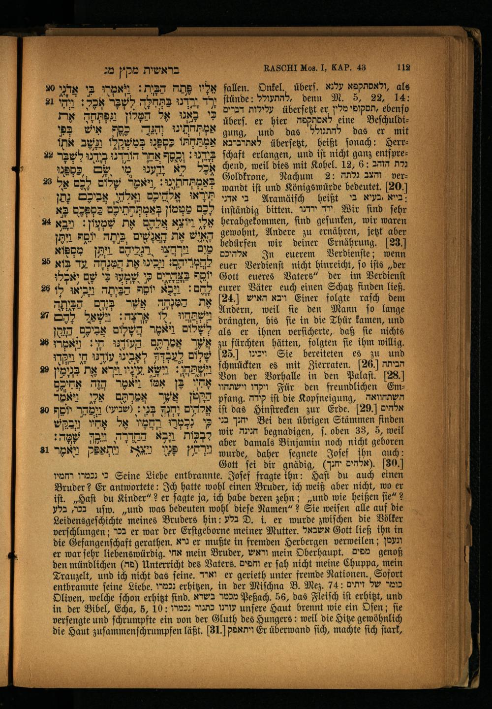 24 ויבא האיש Einer folgte raſch dem Andern, weil ſie den Mann ſo lange drängten, bis ſie in die Thür kamen, und als er ihnen verſicherte, daß ſie nichts zu fürchten hätten, folgten ſie ihm willig. 25.) 2 Sie bereiteten es zu und ſchmückten es mit Zierraten. 26] הביתה Von der Vorhalle in den Palaſt. 28.) ויקדו וישתחוו Für den freundlichen Empfang. M iſt die Kopfneigung, השתחוואה iſt das Hinſtrecken zur Erde. 29. אלהים יהגך בני Bei den übrigen Stämmen finden wir חנינה begnadigen, ſ. oben 33, 5, weil aber damals Binjamin noch nicht geboren wurde, daher ſegnete Joſef ihn auch: Gott ſei dir gnaͤdig,(JM(אלהים 36]