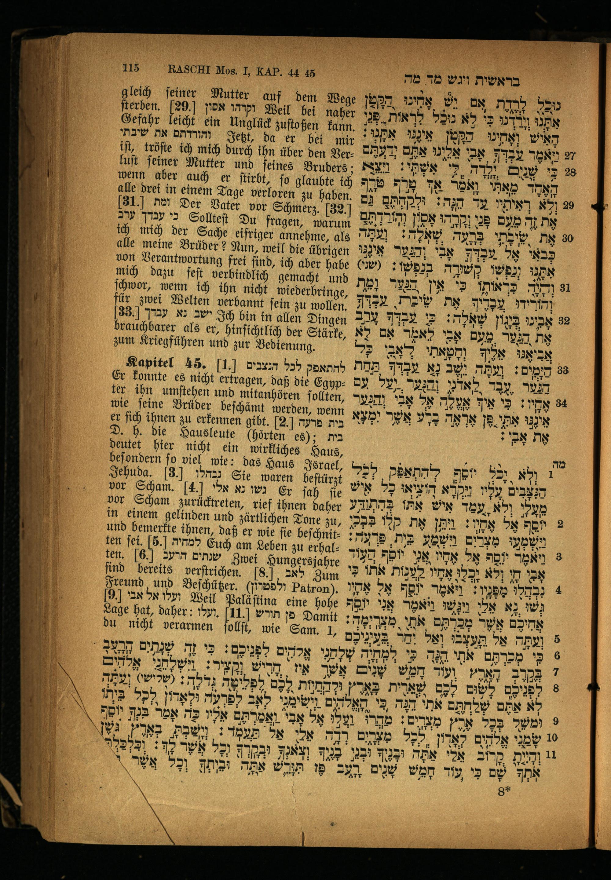 ſterben. 29g וקרהו אסון Weil bei naher לראות פני b555 וורדנו 2 לא DAN Gefahr leicht ein Unglück zuſtoßen kann. האיש ואחינו הפמו איננו אתנו. את שיבתי drrrnm Jetzt, da er bei mir 7 en En. mn ö 9 iſt, tröſte ich mich durch ihn über den Ver. ידעתם DNS אָבי אלונו fas we, לפ luſt ſeiner Mutter und feines Bruders; SEN: De שנים. לי 5 28 wenn aber auch er ſtirbt, fo glaubte ich אך טרף טרף NL הָאֶחֶד מאתי alle drei in einem Tage verloren zu haben. m}. עד הַנֶה: mn 821 29 [31.] u Der Vater vor Schmerz.[32.] והורדתס p mi,, את זה מעַם כי עבדך ערב Sollteſt Du fragen, warum MM] k ו ich mich der Sache eifriger annehme, als 73: zr, אֶת ,ל, בּרְעָה alle meine Brüder? Nun, weil die übrigen 3X Man כָּבאִי אֶל עַבְד אָבי von Verantwortung frei find, ich aber habe ונפשו קֶשוּרֶה בנפשו:(שני) DAN va.. DB) כי אין הגער miss ודה wenn ich ihn nicht wiederbringe,. יי Jay f für zwei Welten verbannt ſein zu ö A 3* ,, ]35.[ ישב נא עבדך Ih bin in allen Dingen 3 כו עכרף TON אָבינו בינון brauchbarer als er, hinſichtlich der Stärke, y de hd 3 DR אֶת הנער zum Kriegführen und zur Bedienung.>> 27 וְחְטָאתִי Jh אביאָנו