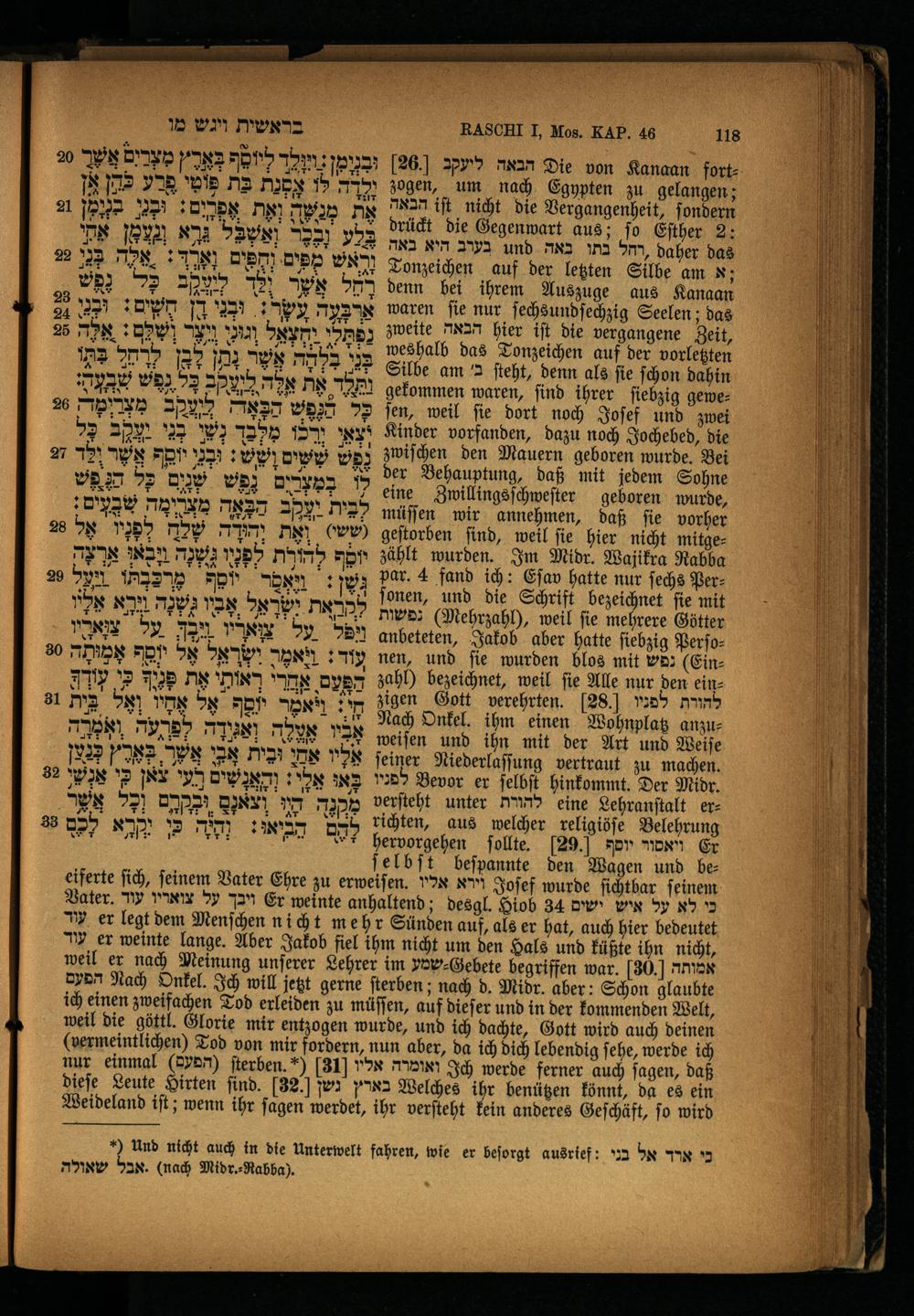 [26.] הבאה ליעקב Die von Kanaan fort zogen, um nach Egypten zu gelangen; הבאה iſt nicht die Vergangenheit, ſondern drückt die Gegenwart aus; ſo Eſther 2: בערב היא באה und ,רהל בתו באה daher das Tonzeichen auf der letzten Silbe am N; denn bei ihrem Auszuge aus Kangan waren ſie nur ſechsundſechzig Seelen; das zweite הבאה hier iſt die vergangene Zeit, weshalb das Tonzeichen auf der vorletzten Silbe am R ſteht, denn als fie ſchon dahin gekommen waren, ſind ihrer ſiebzig geweſen, weil ſie dort noch Joſef und zwei Kinder vorfanden, dazu noch Jochebed, die zwiſchen den Mauern geboren wurde. Bei der Behauptung, daß mit jedem Sohne eine Zwillingsſchweſter geboren wurde, müſſen wir annehmen, daß fie vorher geſtorben ſind, weil ſie hier nicht mitgezählt wurden. Im Midr. Wajikra Rabba Par. 4 fand ich: Eſav hatte nur ſechs Perſonen, und die Schrift bezeichnet ſie mit נפשות(Mehrzahh, weil fie mehrere Götter anbeteten, Jakob aber hatte ſiebzig Perſonen, und fie wurden blos mit נפש(Einzahl) bezeichnet, weil fie Alle nur den ein zigen Gott verehrten. 28) להורת לפנו Nach Onkel. ihm einen Wohnplatz anzuweiſen und ihn mit der Art und Weiſe ſeiner Niederlaſſung vertraut zu machen. לפניו Bevor er ſelbſt hinkommt. Der Midr. verſteht unter להורת eine Lehranſtalt er— richten, aus welcher religiöſe Belehrung hervorgehen ſollte. 29.) ויאסור יוסף Er ſelbſt beſpannte den Wagen und be—