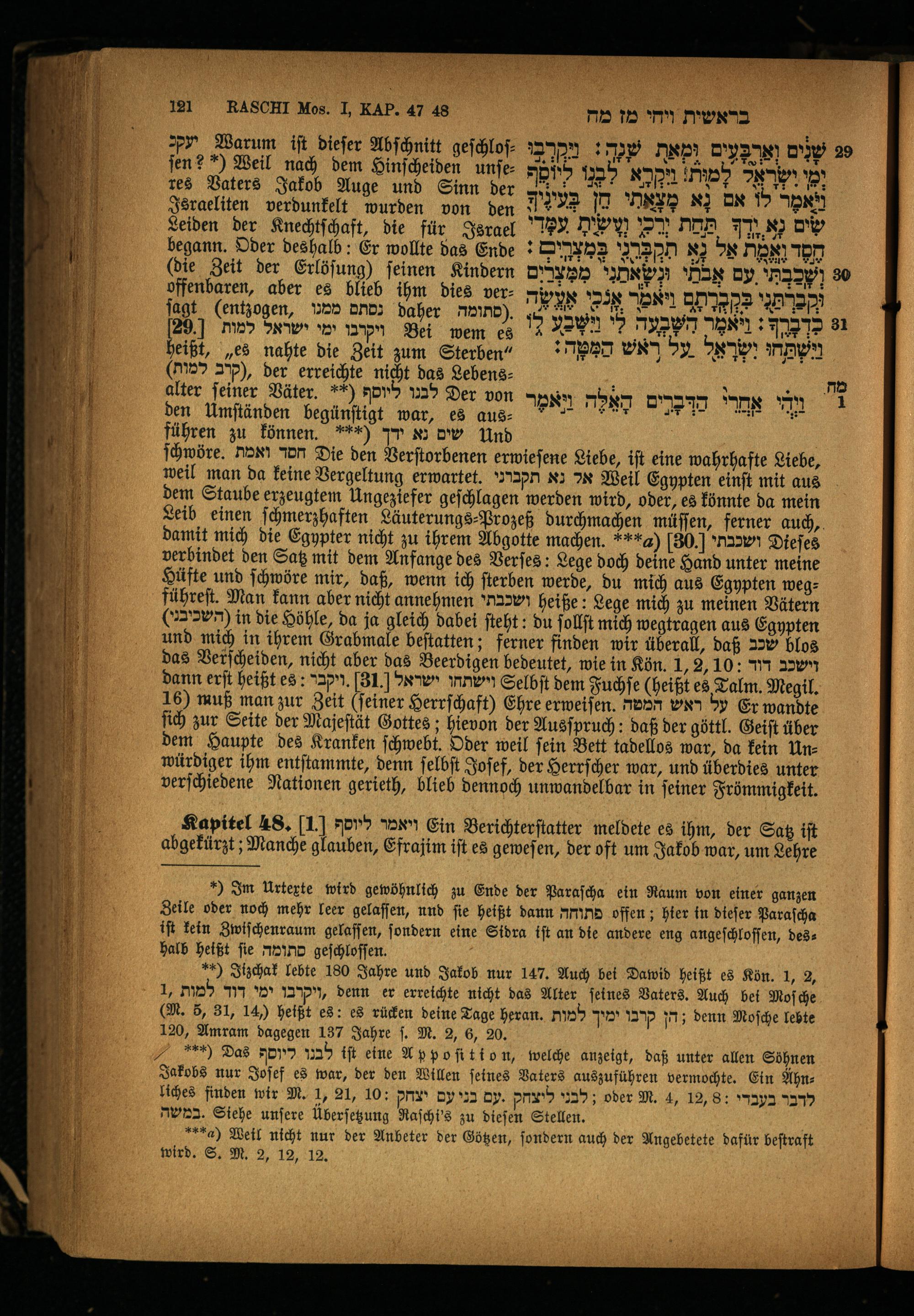 ſchwöre. חסד ואמת Die den Verſtorbenen erwieſene Liebe, iſt eine wahrhafte Liebe, weil man da keine Vergeltung erwartet. אל נא תקברני Weil Egypten einſt mit aus dem Staube erzeugtem Ungezlefer geſchlagen werden wird, oder, es könnte da mein Leib einen ſchmerzhaften Läuterungs-Prozeß durchmachen müſſen, ferner auch, damit mich die Egypter nicht zu ihrem Abgotte machen.***g) 30. ושכבתי 56 verbindet den Satz mit dem Anfange des Verſes: Lege doch deine Hand unter meine Hüfte und ſchwöre mir, daß, wenn ich ſterben werde, du mich aus Egypten wegführeſt. Man kann aber nicht annehmen ושכבתי heiße: Lege mich zu meinen Vätern (השכיבני) in die Höhle, da ja gleich dabei ſteht: du ſollſt mich wegtragen aus Egypten und mich in ihrem Grabmale beſtatten; ferner finden wir überall, daß שכב% das Verſcheiden, nicht aber das Beerdigen bedeutet, wie in Kön. 1, 3, 10: וישכב דוד dann erſt heißt es: 33. 31] וישתחו ישראל Selbſt dem Fuchſe(heißt es Talm. Megil. 16) muß man zur Zeit(ſeiner Herrſchaft) Ehre erweiſen. x3 על ראש Er wandte ſich zur Seite der Majeſtät Gottes; hievon der Ausſpruch: daß der göttl. Geiſt über dem Haupte des Kranken ſchwebt. Oder weil ſein Bett tadellos war, da kein Unwürdiger ihm entſtammte, denn ſelbſt Joſef, der Herrſcher war, und überdies unter verſchiedene Nationen gerieth, blieb dennoch unwandel bar in ſeiner Frömmigkeit.