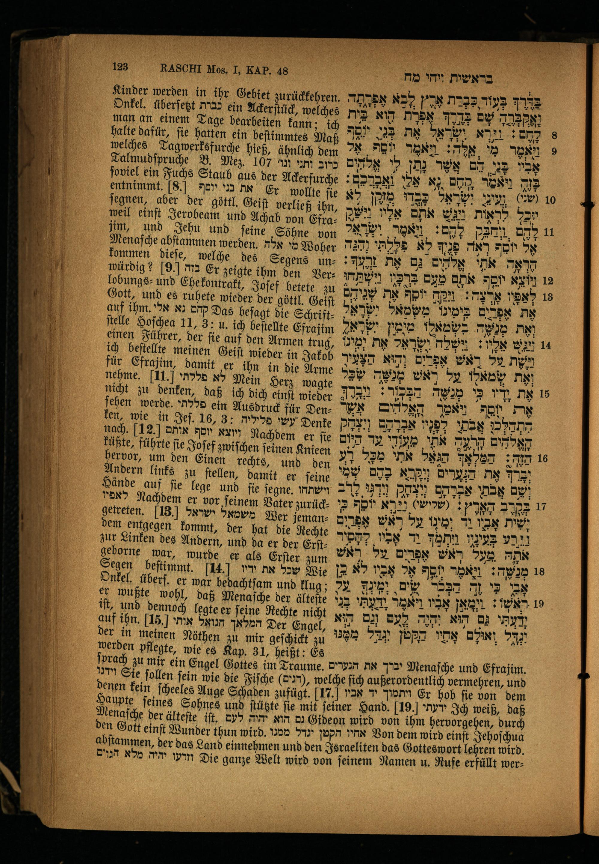 hervor, um den Einen rechts, und den Andern links zu ſtellen, damit er ſeine Hände auf ſie lege und ſie 16016. וישתחו לאפיו Nachdem er vor ſeinem Vater zurückgetreten. 13 משמאל ישראל Wer jemandem entgegen kommt, der hat die Rechte zur Linken des Andern, und da er der Erſtgeborne war, wurde er als Erſter zum Segen beftimmt.[14.] n שכל את Wie Onkel. überſ. er war bedachtſam und klug; er wußte wohl, daß Menaſche der älteſte iſt, und dennoch legte er ſeine Rechte nicht auf ihn.[15,] המלאך חנואל אותי Der Engel, der in meinen Nöthen zu mir geſchickt zu werden pflegte, wie es Kap. 31, heißt: Es ſprach וידגר Sie ſollen