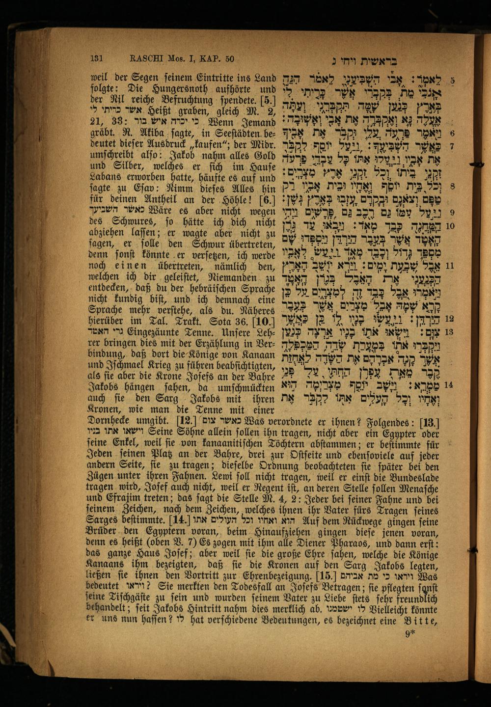 Dornhecke umgibt. 12. כאשר צום Was verordnete er ihnen? Folgendes: 13 וישאו אתו בניו Seine Söhne allein ſollen ihn tragen, nicht aber ein Egypter oder ſeine Enkel, weil fie von kanganitiſchen Töchtern abſtammen; er beſtimmte für Jeden ſeinen Platz an der Bahre, drei zur Oſtſeite und ebenſoviele auf jeder andern Seite, ſie zu tragen; dieſelbe Ordnung beobachteten ſie ſpäter bei den Zügen unter ihren Fahnen. Lewi ſoll nicht tragen, weil er einſt die Bundeslade tragen wird, Joſef auch nicht, weil er Regent iſt, an deren Stelle ſollen Menaſche und Efrajim treten; das ſagt die Stelle M. 4, 2: Jeder bei ſeiner Fahne und bei ſeinem Zeichen, nach dem Zeichen, welches ihnen ihr Vater fürs Tragen ſeines Sarges beſtimmte. 14. הוא ואחיו וכל העולים אתו Auf dem Rückwege gingen feine Brüder den Egyptern voran, beim Hinaufziehen gingen dieſe jenen voran, denn es heißt(oben V. 7) Es zogen mit ihm alle Diener Pharaos, und dann erſt: das ganze Haus Joſef; aber weil ſie die große Ehre ſahen, welche die Könige Kanaans ihm bezeigten, daß fie die Kronen auf den Sarg Jakobs legten, ließen fie ihnen den Vortritt zur Ehrenbezeigung. 15. ויראו כי מת אביהם 8 bedeutet ויראר? Sie merkten den Todesfall an Joſefs Betragen; fie pflegten. ſeine Tiſchgäſte zu ſein und wurden ſeinem Vater zu Liebe ſtets ſehr freundlich behandelt; ſeit Jakobs Hintritt nahm dies merklich ab. לו ישטמנו Vielleicht könnte er uns nun haſſen? לו hat verſchiedene Bedeutungen, es bezeichnet eine Bitte, 9*