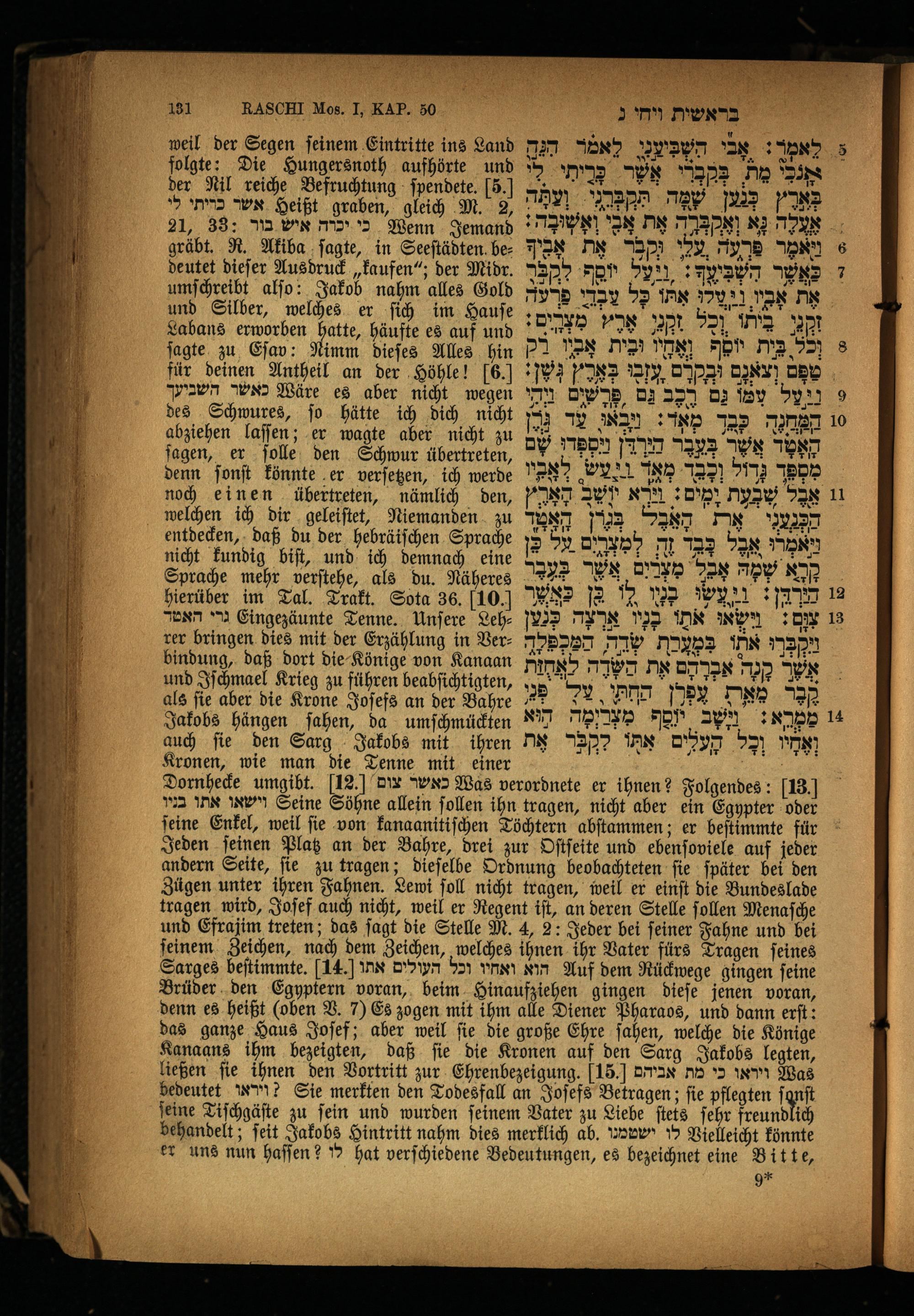 weil der Segen feinem Eintritte ins Land folgte: Die Hungersnoth aufhörte und der Nil reiche Befruchtung ſpendete. 5.) אשר כריתי לי Heißt graben, gleich M. 2, 21, 33: כ יכרה איש בור Wenn Jemand gräbt. R. Akiba ſagte, in Seeſtädten bedeutet dieſer Ausdruck kaufen“; der Midr. umſchreibt alſo: Jakob nahm alles Gold und Silber, welches er ſich im Hauſe Labans erworben hatte, häufte es auf und ſagte zu Eſav: Nimm dieſes Alles hin für deinen Antheil an der Höhle! 6. כאשר השביעך Wäre es aber nicht wegen des Schwures, ſo hätte ich dich nicht abziehen laſſen; er wagte aber nicht zu ſagen, er ſolle den Schwur übertreten, denn ſonſt könnte er verſetzen, ich werde noch einen übertreten, welchen ich dir geleiſtet, Niemanden zu entdecken, daß du der hebräiſchen Sprache nicht kundig biſt, und ich demnach eine Sprache mehr verſtehe, als du. Näheres hierüber im Tal. Trakt. Sota 36. 10. האטר Eingezäunte Tenne. Unſere Leh— rer bringen dies mit der Erzählung in Ver