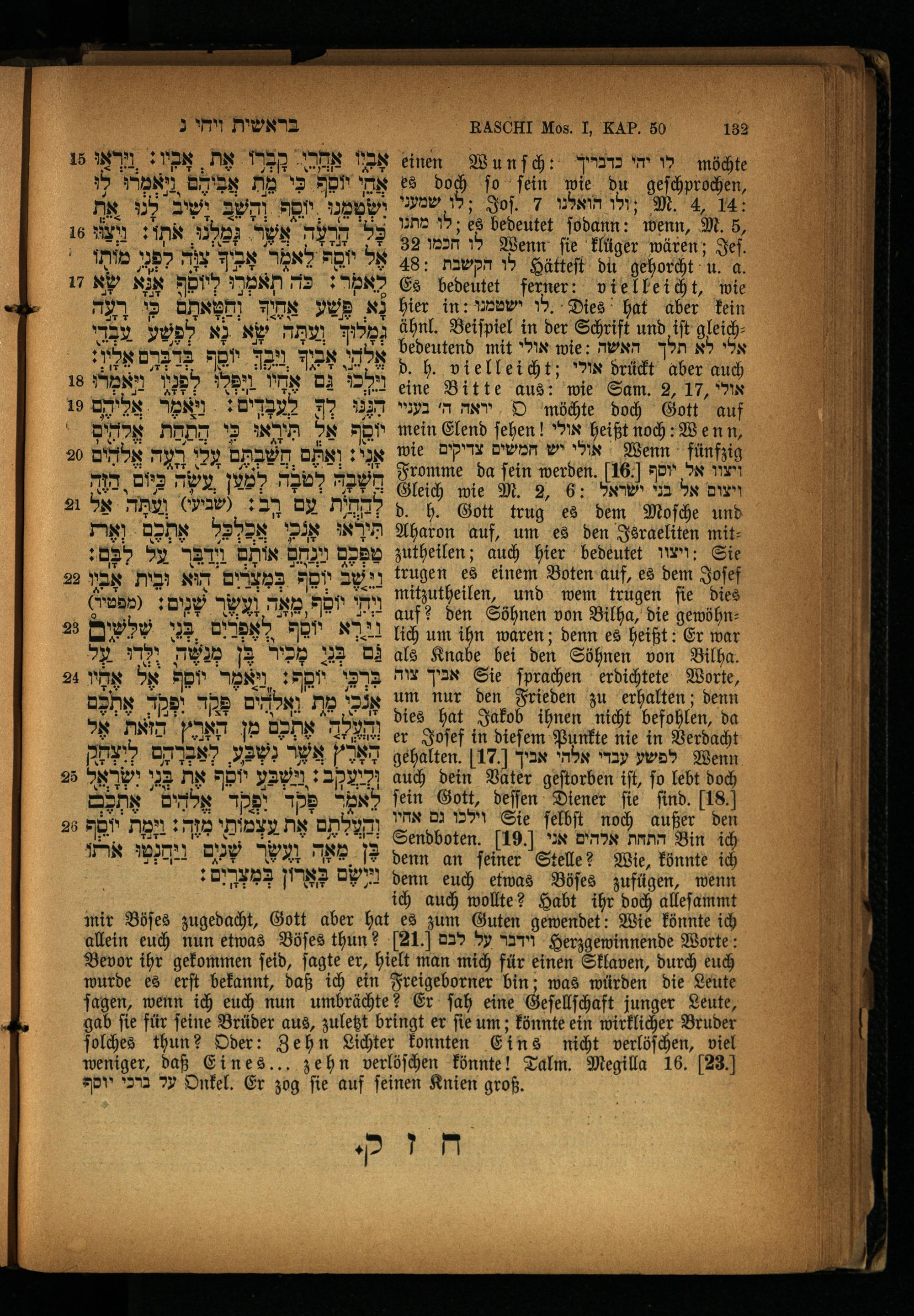 einen Wunſch: לויהי כדבריך 6 es doch ſo fein wie du geſchprochen, לו שמעני; Sof. 7 הואלנו wr; M. 4, 14 מתנו; es bedeutet ſodann: wenn, M. 5, 32 לו הכמו Wenn fie klüger wären; Jeſ. 48: הקשבת w Hätteſt du gehorcht u. a. Es bedeutet ferner: vielleicht, wie hier in: ישטמנו w. Dies hat aber kein ähnl. Beiſpiel in der Schrift und iſt gleichbedeutend mit אולי wie: wen oh אלי לא d. h. vielleicht; אולי drückt aber auch eine Bitte aus: wie Sam. 2, 17,** בעניי n יראה möchte doch Gott auf mein Elend ſehen!"N heißt noch: Wenn, wie יש חמשים צדיקים wo, Wenn fünfzig Fromme da fein werden. 16] ויצוו אל, יוסף Gleich wie M. 2, 6: ויצום אל בני ישראל d. h. Gott trug es dem Moſche und Aharon auf, um es den Israeliten mitzutheilen; auch hier bedeutet ny: Sie trugen es einem Boten auf, es dem Joſef mitzutheilen, und wem trugen ſie dies auf? den Söhnen von Bilha, die gewöhnlich um ihn waren; denn es heißt: Er war als Knabe bei den Söhnen von Bilha. אביך צוה Sie ſprachen erdichtete Worte, um nur den Frieden zu erhalten; denn dies hat Jakob ihnen nicht befohlen, da er Joſef in dieſem Punkte nie in Verdacht gehalten. 17] Pax אלהי way לפשע Wenn auch dein Vater geſtorben iſt, ſo lebt doch