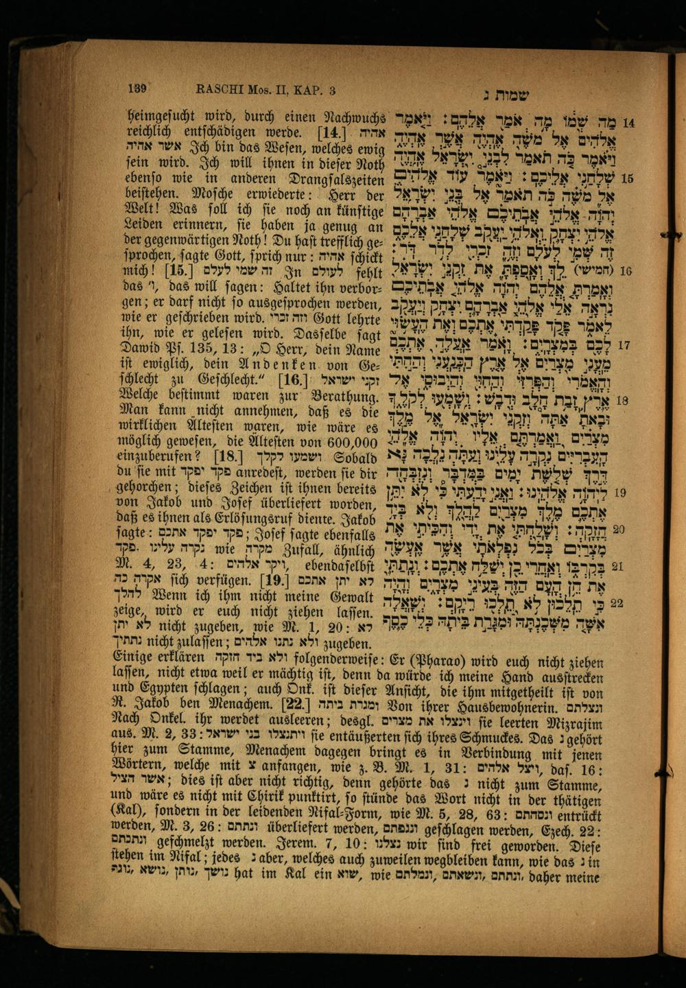 reichlich entſchädigen werde. 14 אהיה אשר אהיה Ich bin das Weſen, welches ewig ſein wird. Ich will ihnen in dieſer Noth ebenſo wie in anderen Drangſalszeiten beiſtehen. Moſche erwiederte: Herr der Welt! Was ſoll ich ſie noch an künſtige Leiden erinnern, ſie haben ja genug an der gegenwärtigen Noth! Du haft trefflich geſprochen, ſagte Gott, ſprich nur: אהיה mich![15.] זה שמי לעלם In לעולם fehlt das, das will ſagen: Haltet ihn verbor— gen; er darf nicht ſo ausgeſprochen werden, wie er geſchrieben wird. nm וזה Gott lehrte ihn, wie er geleſen wird. Dasſelbe fagt Dawid Pſ. 135, 13:„O Herr, dein Name iſt ewiglich, dein Andenken von Ge: ſchlecht zu Geſchlecht. 16 זקני ישראל Welche beſtimmt waren zur Berathung. Man kann nicht annehmen, daß es die wirklichen Alteſten waren, wie wäre es möglich geweſen, die AÄlteſten von 600,000 einzuberufen? 18) לקלך wor Sobald
