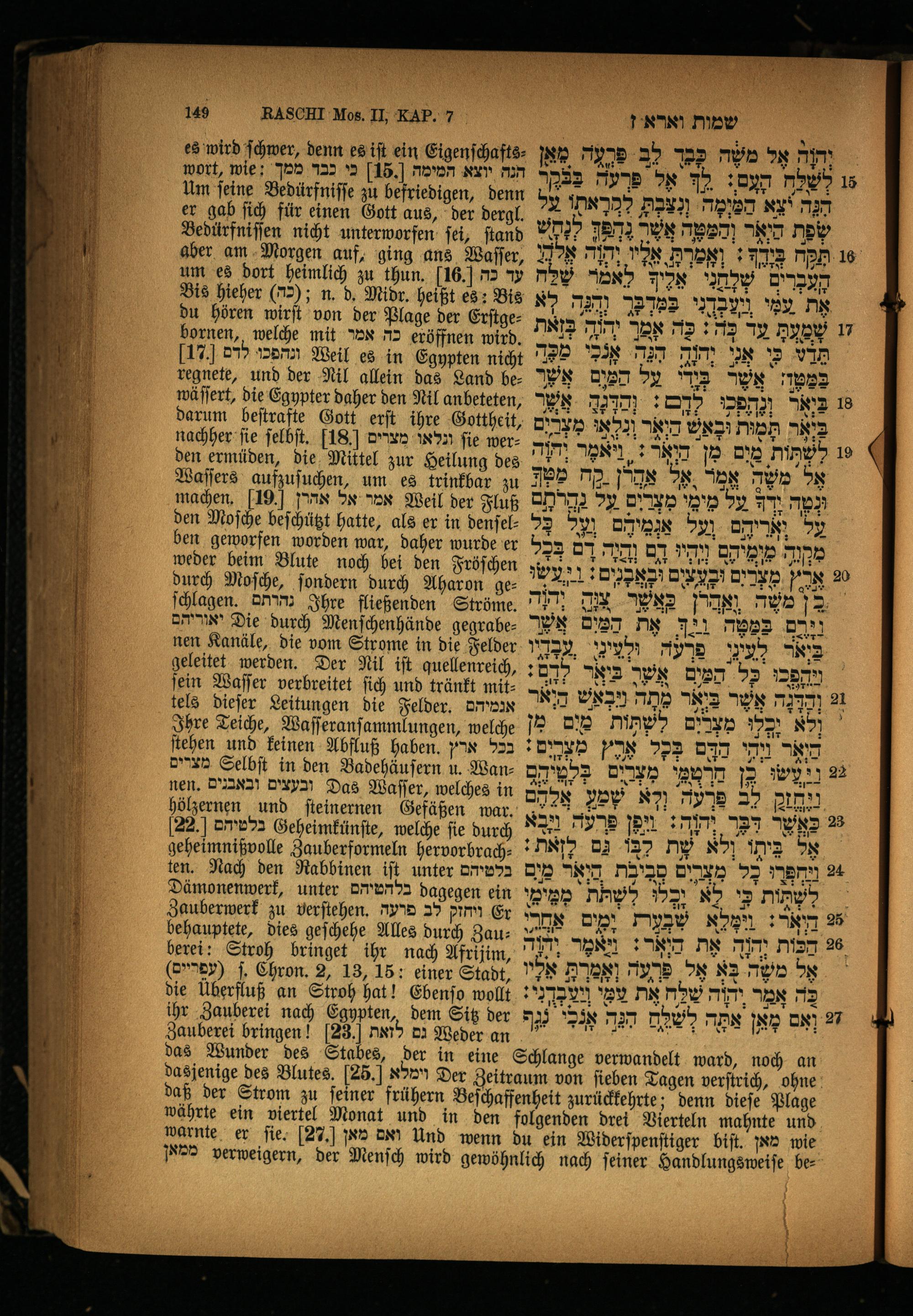 nachher fie ſelbſt. 18] מצרים Kon fie werden ermüden, die Mittel zur Heilung des Waſſers aufzuſuchen, um es trinkbar zu machen. 19 אמר אל אהרן Weil der Fluß den Moſche beſchützt hatte, als er in denſelben geworfen worden war, daher wurde er weder beim Blute noch bei den Fröſchen durch Moſche, ſondern durch Aharon geſchlagen. נהרתם Ihre fließenden Ströme. יאוריהם Die durch Menſchenhände gegrabenen Kanäle, die vom Strome in die Felder geleitet werden. Der Nil iſt quellenreich, ſein Waſſer verbreitet ſich und tränkt mit: tels dieſer Leitungen die Felder. אנמיהם Ihre Teiche, Waſſeranſammlungen, welche ſtehen und keinen Abfluß haben. ארץ 23 מצרים Selbſt in den Badehäuſern u. Wan: nen. ובעצים ובאבנים Das Waſſer, welches in hölzernen und ſteinernen Gefäßen war. [22.] 27093 Geheimkünſte, welche fie durch geheimnißvolle Zauberformeln hervorbrachten. Nach den Rabbinen iſt unter בלטיהם Dämonenwerk, unter בלהטיהם dagegen ein Zauberwerk zu verſtehen. ויחזק לב פרעה Er behauptete, dies geſchehe Alles durch Zau— berei: Stroh bringet ihr nach Afrijim, (עפריים) ſ. Ehron. 2, 13, 15: einer Stadt, die Überfluß an Stroh hat! Ebenſo wollt ihr Zauberei nach Egypten, dem Sitz der Zauberei bringen! 23. גם לזאת Weder an das Wunder des Stabes, der in