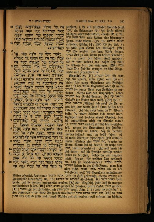 ſchlagen, aber nicht tödten, ebenſo M. 2, 21: ונגפו אשה הרה und ſtoßen eine ſchwangere Frau, nicht tödten; Jer. 13: יתננפו רגליכם anſtoßen. Pſalm 91: 1383 San;פן Jeſ. 5 ולאבן נגף zum Stein des Anſtoßes. 28. ועלו Sie werden aus dem Fluße ſteigen. בביתך Erſt zu dir, dann zu deinen Dienern; weil er zuerſt den böſen Rath gegeben: ויאמר אל עמו(oben 1,9, daher ließ Gott die Strafe bei ihm anfangen. 29 ובכה ובעמך Die Fröſche drangen in ihre Eingeweide und zerwühlten ſie.