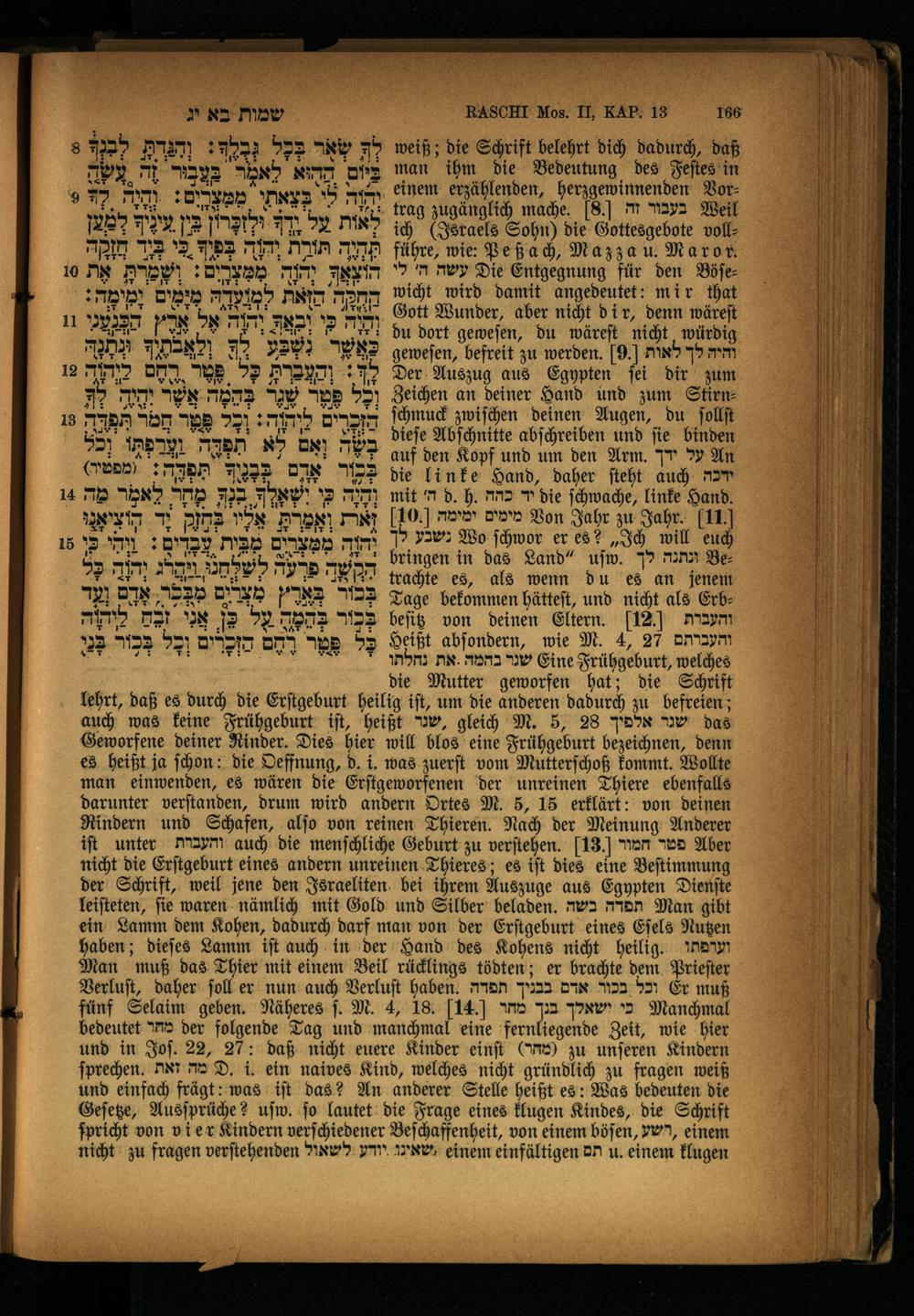 : z: befiß von deinen Eltern. 12 והעברת 433. בכור de, הזכרים de כל פטר Hfißt abſondern, wie M. 4, 27 והעברתם ö mon; שגר בהמה.את Cine Frühgeburt, welches die Mutter geworfen hat; die Schrift lehrt, daß es durch die Erſtgeburt heilig iſt, um die anderen dadurch zu befreien; auch was keine Frühgeburt iſt, heißt ,שגר gleich M. 5, 98 שגר אלפיך 4 Geworfene deiner Rinder. Dies hier will blos eine Frühgeburt bezeichnen, denn es heißt ja ſchon: die Oeffnung, d. i. was zuerſt vom Mutterſchoß kommt. Wollte man einwenden, es wären die Erſtgeworfenen der unreinen Thiere ebenfalls darunter verſtanden, drum wird andern Ortes M. 5, 15 erklärt: von deinen Rindern und Schafen, alſo von reinen Thieren. Nach der Meinung Anderer iſt unter warm auch die menſchliche Geburt zu verſtehen. 13. חמור Ms Aber nicht die Erſtgeburt eines andern unreinen Thieres; es iſt dies eine Beſtimmung der Schrift, weil jene den Israeliten bei ihrem Auszuge aus Egypten Dienſte leiſteten, fie waren nämlich mit Gold und Silber beladen. תפדה בשה Man gibt ein Lamm dem Kohen, dadurch darf man von der Erſtgeburt eines Eſels Nutzen haben; dieſes Lamm iſt auch in der Hand des Kohens nicht heilig. וערפתו Man muß das Thier mit einem Beil rücklings tödten; er brachte dem Prieſter Verluſt, daher ſoll er nun auch Verluſt haben. en 733 וכל בכור אדם Er muß fünf Selaim geben. Näheres ſ. M. 4, 18. 14. כי ישאלך בנך מחר Manchmal bedeutet מחר der folgende Tag und manchmal eine fernliegende Zeit, wie hier und in Joſ. 22, 27: daß nicht euere Kinder einſt CMS) zu unſeren Kindern ſprechen. Rr מה D. i. ein naives Kind, welches nicht gründlich zu fragen weiß und einfach frägt: was iſt das? An anderer Stelle heißt es: Was bedeuten die Geſetze, Ausſprüche? uſw. ſo lautet die Frage eines klugen Kindes, die Schrift ſpricht von vier Kindern verſchiedener Beſchaffenheit, von einem böſen, ,רשע einem nicht zu fragen verſtehenden ישאינר יודע לשאול einem einfältigen תם u. einem klugen