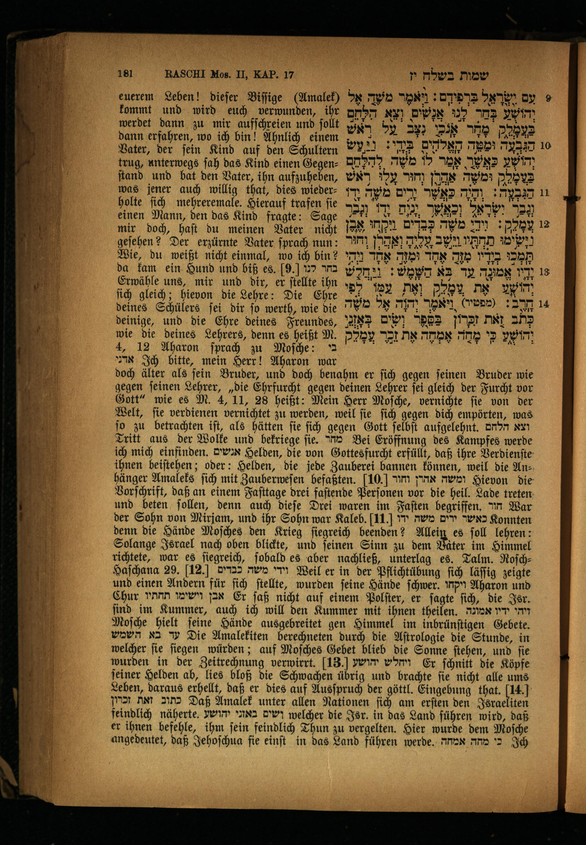 wie die deines Lehrers, denn es heißt M. 4, 12 Aharon ſprach zu Moſche: 2 אדני Ich bitte, mein Herr! Aharon war doch älter als ſein Bruder, und doch benahm er ſich gegen ſeinen Bruder wie gegen ſeinen Lehrer,„die Ehrfurcht gegen deinen Lehrer ſei gleich der Furcht vor Gott“ wie es M. 4, 11, 28 heißt: Mein Herr Moſche, vernichte ſie von der Welt, ſie verdienen vernichtet zu werden, weil ſie ſich gegen dich empörten, was jo zu betrachten iſt, als hätten fie ſich gegen Gott ſelbſt aufgelehnt. וצא הלחם Tritt aus der Wolke und bekriege fie. מדר Bei Eröffnung des Kampfes werde ich mich einfinden. אנשים Helden, die von Gottesfurcht erfüllt, daß ihre Verdienſte ihnen beiſtehen; oder: Helden, die jede Zauberei bannen können, weil die Anhänger Amaleks ſich mit Zauberweſen befaßten. 10 ומשה אהרן וחור Hievon die Vorſchrift, daß an einem Faſttage drei faſtende Perſonen vor die heil. Lade treten und beten ſollen, denn auch dieſe Drei waren im Faſten begriffen. n War der Sohn von Mirjam, und ihr Sohn war Kaleb. 11] כאשר ירים. משה ידו Konnten denn die Hände Moſches den Krieg ſiegreich beenden? Allein es ſoll lehren: Solange Israel nach oben blickte, und ſeinen Sinn zu dem Vater im Himmel richtete, war es ſiegreich, ſobald es aber nachließ, unterlag es. Talm. RoſchHaſchana 29. 12.) וידי משה כבדים Weil er in der Pflichtübung ſich läſſig zeigte und einen Andern für ſich ſtellte, wurden feine Hände ſchwer. ויקחו Aharon und Chur Pan אבן וישימו Er ſaß nicht auf einem Polſter, er ſagte ſich, die Jsr. find im Kummer, auch ich will den Kummer mit ihnen theilen. wax זיהי ידיו Moſche hielt ſeine Hände ausgebreitet gen Himmel im inbrünſtigen Gebete. עד בא השמש Die Amalekiten berechneten durch die Aſtrologie die Stunde, in welcher ſie ſiegen würden; auf Moſches Gebet blieb die Sonne ſtehen, und ſie wurden in der Zeitrechnung verwirrt. 13.) וחלש יהושע Er ſchnitt die Köpfe ſeiner Helden ab, lies bloß die Schwachen übrig und brachte ſie nicht alle ums Leben, daraus erhellt, daß er dies auf Ausſpruch der göttl. Eingebung that. Pe כתוב זאת זכרון Daß Amalek unter allen Nationen ſich am erſten den Israeliten feindlich näherte., ושים באדי יהושע welcher die Isr. in das Land führen wird, daß er ihnen befehle, ihm ſein feindlich Thun zu vergelten. Hier wurde dem Moſche angedeutet, daß Jehoſchua fie einſt in das Land führen werde. כי מחה אמחה 00
