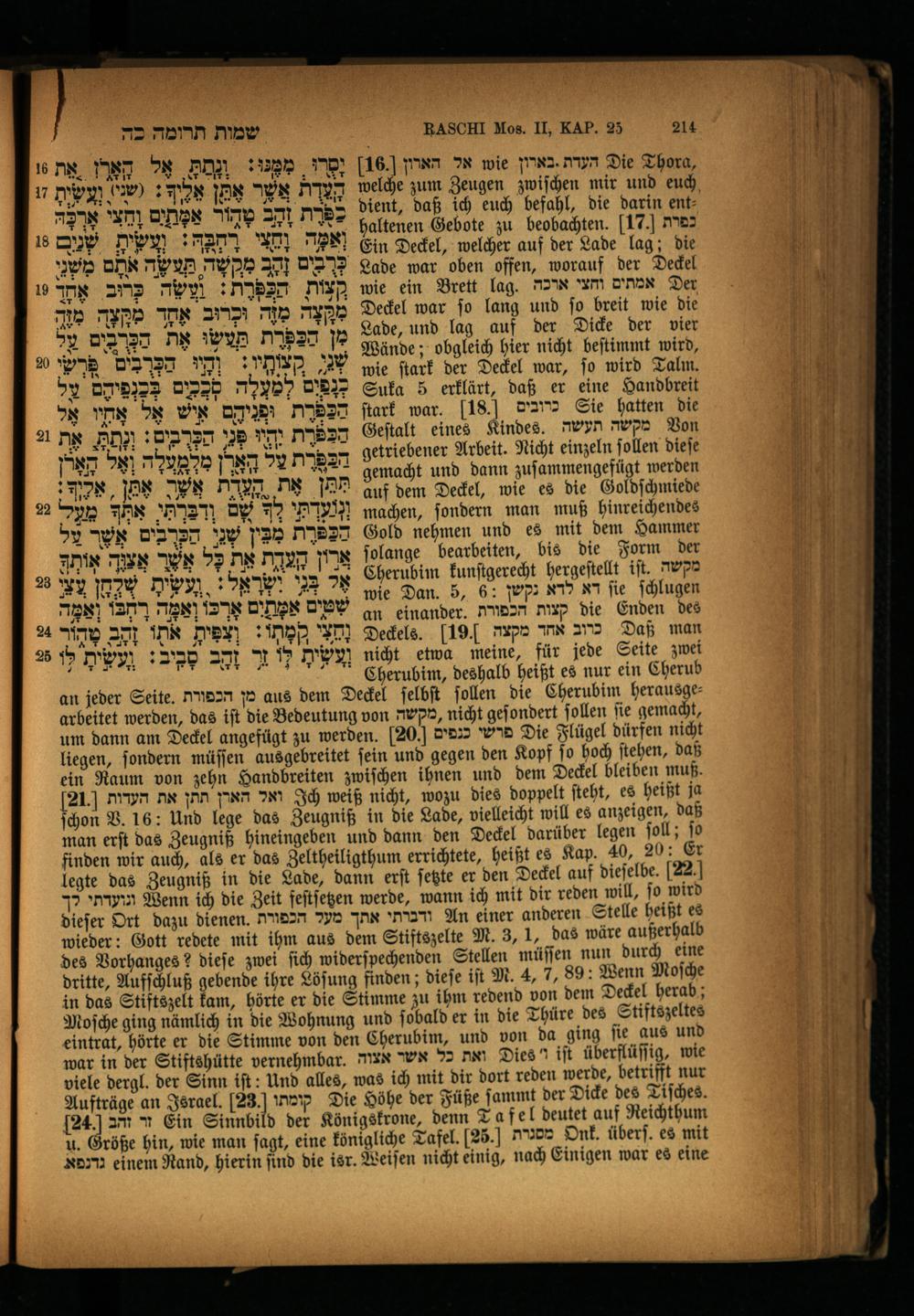 16 אל הארון wie העדת.בארון Die Thora, welche zum Zeugen zwiſchen mir und euch dient, daß ich euch befahl, die darin enthaltenen Gebote zu beobachten. 17 כפרת Ein Deckel, welcher auf der Lade lag; die Lade war oben offen, worauf der Deckel wie ein Brett lag. אמתים וחצי ארכה Der Deckel war ſo lang und ſo breit wie die Lade, und lag auf der Dicke der vier Wände; obgleich hier nicht beſtimmt wird, wie ſtark der Deckel war, ſo wird Talm. Suka 5 erklärt, daß er eine Handbreit ſtark war. 18 כרובים Sie hatten die Geſtalt eines Kindes. מקשה תעשה Von getriebener Arbeit. Nicht einzeln ſollen dieſe gemacht und dann zuſammengefügt werden auf dem Deckel, wie es die Goldſchmiede machen, ſondern man muß hinreichendes Gold nehmen und es mit dem Hammer ſolange bearbeiten, bis die Form der Cherubim kunſtgerecht hergeſtellt iſt.* wie Dan. 5, 6: דא לדא נקשן fie ſchlugen an einander. קצות הכפורת die Enden des Deckels. 19 אחד מקצה 375 Daß man nicht etwa meine, für jede Seite zwei Cherubim, deshalb heißt es nur ein Cherub