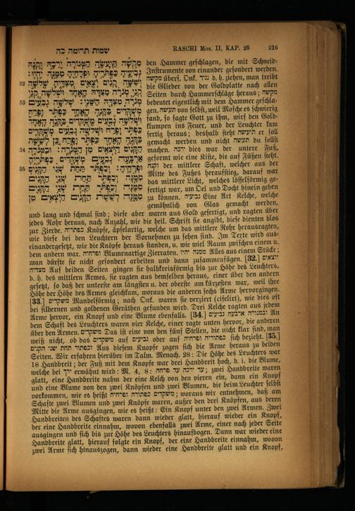 RASCHI Mos. Il, KAP. 25 216 den Hammer geſchlagen, die mit SchneidInſtrumente von einander geſondert werden. מקשה überſ. Onk. Ya: d. h, ziehen, man treibt die Glieder von der Goldplatte nach allen Seiten durch Hammerſchläge heraus; מקשה bedeutet eigentlich mit dem Hammer geſchlagen. תעשה von ſelbſt, weil Moſche es ſ chwierig fand, ſo ſagte Gott zu ihm, wirf den Goldklumpen ins Feuer, und der Leuchter kam fertig heraus; deshalb ſteht תיעשה er ſoll gemacht werden und nicht תעשה du ſollſt machen. ירכה dies war der untere Fuß, geformt wie eine Kiſte, die auf Füßen ſteht. וקנה der mittlere Schaft, welcher aus der Mitte des Fußes heraufſtieg, darauf war das mittlere Licht, welches löffelförmig gefertigt war, um Del und Docht hinein geben zu können. 7222 Eine Art Kelche, welche gemöhnlich von Glas gemacht werden, gefertigt, und ragten über