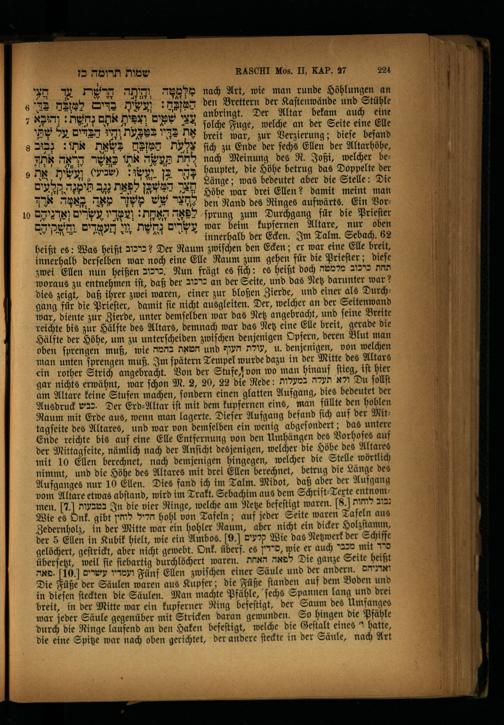 ö. innerhalb der Ecken. Im Talm. Sebach. 62 heißt es: Was heißt כרכוב? Der Raum zwiſchen den Ecken; er war eine Elle breit, innerhalb derſelben war noch eine Elle Raum zum gehen für die Prieſter; dieſe zwei Ellen nun heißen כרכוב Nun frägt es ſich: es heißt doch תחת כרכוב מלמטה woraus zu entnehmen 14, daß der M* an der Seite, und das Netz darunter war? dies zeigt, daß ihrer zwei waren, einer zur bloßen Zierde, und einer als Durchgang für die Prieſter, damit ſie nicht ausgleiten. Der, welcher an der Seitenwand war, diente zur Zierde, unter demſelben war das Netz angebracht, und ſeine Breite reichte bis zur Hälfte des Altars, demnach war das Netz eine Elle breit, gerade die Hälfte der Höhe, um zu unterſcheiden zwiſchen denjenigen Opfern, deren Blut man oben ſprengen muß, wie חטאת בהמה und העוף My,.א denjenigen, von welchen man unten ſprengen muß. Im ſpätern Tempel wurde dazu in der Mitte des Altars ein rother Strich angebracht. Von der Stufe, von wo man hinauf ſtieg, iſt hier gar nichts erwähnt, war ſchon M. 2, 20, 22 die Rede: ולא תעלה במעלות Du ſollſt am Altare keine Stufen machen, ſondern einen glatten Aufgang, dies bedeutet der Ausdruck 22. Der Erd⸗AUltar iſt mit dem kupfernen eins, man füllte den hohlen Raum mit Erde aus, wenn man lagerte. Dieſer Aufgang befand ſich auf der Mittagſeite des Altares, und war von demſelben ein wenig abgeſondert; das untere Ende reichte bis auf eine Elle Entfernung von den Umhängen des Vorhofes auf der Mittagſeite, nämlich nach der Anſicht desjenigen, welcher die Höhe des Altares mit 10 Ellen berechnet, nach demjenigen hingegen, welcher die Stelle wörtlich nimmt, und die Höhe des Altares mit drei Ellen berechnet, betrug die Länge des Aufganges nur 10 Ellen. Dies fand ich im Talm. Midot, daß aber der Aufgang vom Altare etwas abſtand, wird im Trakt. Sebachim aus dem Schrift⸗Terte entnommen. 7] בטבעות In die vier Ringe, welche am Netze befeſtigt waren. 18 נבוב לוחות Wie es Onk. gibt חליל לוחין hohl von Tafeln; auf jeder Seite waren Tafeln aus Zedernholz, in der Mitte war ein hohler Raum, aber nicht ein dicker Holzſtamm, der 5 Ellen in Kubik hielt, wie ein Ambos.]9.[ קלעים Wie das Netzwerk der Schiffe gelöchert, geſtrickt, aber nicht gewebt. Onk. über]. 68 ,סרדין wie er auch 71225 mit סרד überfetzt, weil fie ſiebartig durchlöchert waren. לפאה האחת Die ganze Seite heißt ועמדיו עשרים[.10].פאה Fünf Ellen zwiſchen einer Säule und der andern. ואדניהם Die Füße der Säulen waren aus Kupfer; die Füße ſtanden auf dem Boden und in dieſen ſteckten die Säulen. Man machte Pfähle, ſechs Spannen lang und drei breit, in der Mitte war ein kupferner Ring befeſtigt, der Saum des Umfanges war jeder Säule gegenüber mit Stricken daran gewunden. So hingen die Pfähle durch die Ringe laufend an den Haken befeſtigt, welche die Geſtalt eines) hatte, die eine Spitze war nach oben gerichtet, der andere ſteckte in der Säule, nach Art