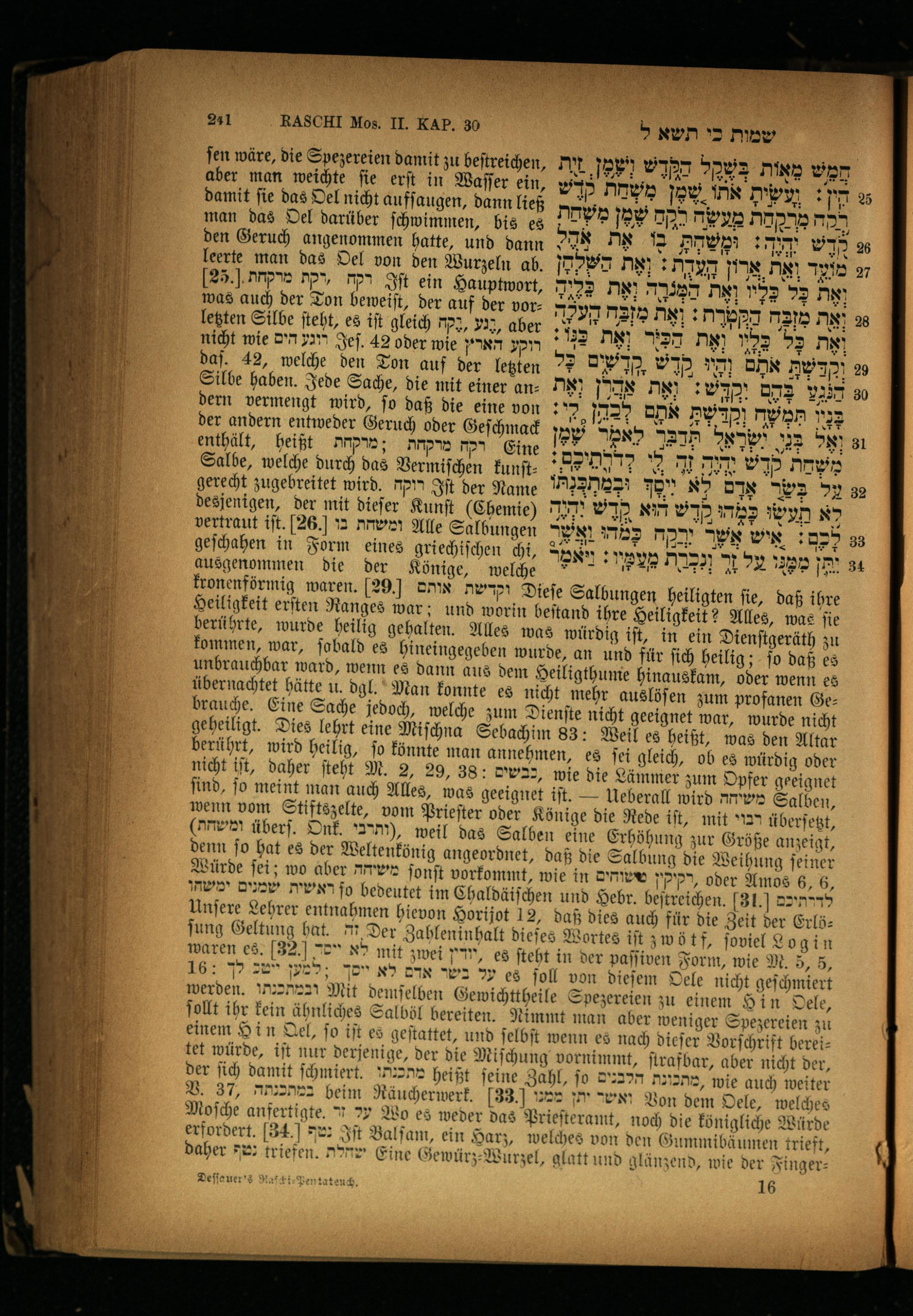fen wäre, die Spezereien damit zu beſtreichen, aber man weichte ſie erſt in Waſſer ein, damit ſie das Oel nicht aufſaugen, dann ließ man das Oel darüber ſchwimmen, bis es den Geruch angenommen hatte, und dann leerte man das Oel von den Wurzeln ab. 125. מרקחת np, רקה Sit ein Hauptwort, was auch der Ton beweiſt, der auf der vorletzten Silbe ſteht, es iſt gleich Sz, vx, aber nicht wie רוגע הים Jeſ. 42 oder wie רוקע האר'ן daſ. 42, welche den Ton auf der letzten Silbe haben. Jede Sache, die mit einer andern vermengt wird, ſo daß die eine von der andern entweder Geruch oder Geſchmack enthält, heißt רכה מרקחת; מרקחת 6 Salbe, welche durch das Vermiſchen kunſtgerecht zugebreitet wird. רוק Iſt der Name desjenigen, der mit dieſer Kunſt(Chemie) vertraut iſt. 26. ומשחת בו 6 Salbungen geſchahen in Form eines griechiſchen chi, ausgenommen die der Könige, welche