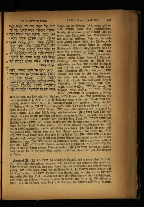 einem Löffel durchrührt, um ſie mit Waſſer zu miſchen; jede Sache, die man recht durchrühren will, wendet man mit dem Finger oder mit dem Löffel um. ממלח מהור קדש Wohl durchrührt, rein und heilig ſoll es fein. 36 ונתת ממנה i, das Räucherwerk, welches täglich auf dem innern Altare dargebracht wurde, der in der Stiftshütte war. אשר אועד So oft ich beſtimmen werde, mit dir zu reden, wird es hier ſein. 37 במתכנתה Mit dem Quantum der Spezereien. 7 קדש יהיה לך Du ſollſt es nur zu Ehren meines Namens machen.[38.] להריה בה Daran zu riechen; doch kannſt du es für dein Geld machen, und der Gemeinde zum Darbringen