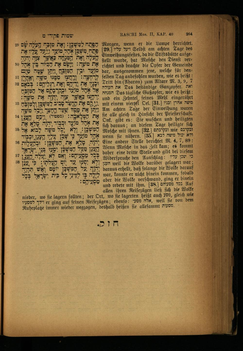 Morgen, wenn er die Lampe herrichtet. 29. ויעל עליו Selbſt am achten Tage des Einweihungsfeſtes, da die Stiftshütte aufgeſtellt wurde, hat Moſche den Dienſt verrichtet und brachte die Opfer der Gemeinde dar, ausgenommen jene, welche für denſelben Tag anbefohlen wurden, wie es heißt: Tritt hin(Aharon) zum Altare M. 3, 9, 7 את העולה Das beſtändige Ganzopfer. ואת המנחה Das tägliche Gußopfer, wie es heißt: und ein Zehntel feines Mehl eingerührt mit einem viertel Oel. 31] משה אהרן ובניו Am achten Tage der Einweihung waren ſie alle gleich in Hinſicht der Prieſterſchaft. Onk. gibt es: Sie wuſchen und heiligten ſich daraus; an dieſem Tage heiligte ſich Moſche mit ihnen. 32 ובקרבתם wie ובקרכם wenn fie nähern. 35. ולא יכול משה לבא Eine andere Stelle berichtet M. 4, 7, 89: