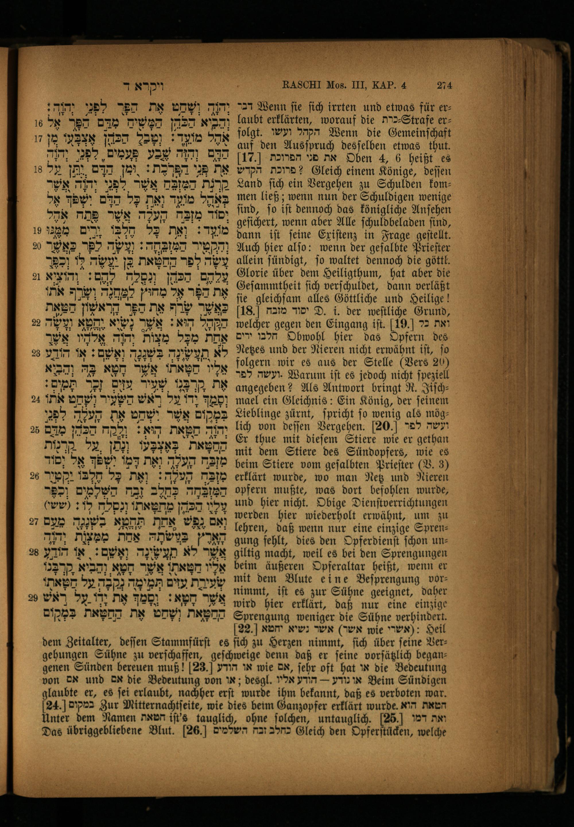 RASCHI Mos. III, KAP. 4 274 "27 Wenn fie ſich irrten und etwas für erlaubt erklärten, worauf die NY>-Strafe erfolgt. wr הקהל Wenn die Gemeinſchaft auf den Ausſpruch desſelben etwas thut. 17.) את מני הפרוכת Oben 4, 6 heißt es ?פרוכת הקדש Gleich einem Könige, deſſen Land ſich ein Vergehen zu Schulden kommen ließ; wenn nun der Schuldigen wenige ſind, ſo iſt dennoch das königliche Anſehen geſichert, wenn aber Alle ſchuldbeladen ſind, dann iſt ſeine Exiſtenz in Frage geſtellt. Auch hier alſo: wenn der geſalbte Prieſter ל allein ſündigt, סן waltet dennoch die göttl. Glorie über dem Heiligthum, hat aber die Geſammtheit ſich verſchuldet, dann verläßt ſie gleichſam alles Göttliche und Heilige! 18. יסוד מזבח D. i. der weſtliche Grund, welcher gegen den Eingang iſt. 19. ואת כל חלבו ירים Obwohl hier das Opfern des Netzes und der Nieren nicht erwähnt iſt, ſo folgern wir es aus der Stelle(Vers 26) -ועשה לפר Warum iſt es jedoch nicht ſpeziell angegeben? Als Antwort bringt R. Jiſchmael ein Gleichnis: Ein König, der ſeinem Lieblinge zürnt, ſpricht Jo wenig als möglich von deſſen Vergehen. 20, ועשה לפר Er thue mit dieſem Stiere wie er gethan mit dem Stiere des Sündopfers, wie es כ beim Stiere vom geſalbten Prieſter(V. 3) erklärt wurde, wo man Netz und Nieren opfern mußte, was dort befohlen wurde, und hier nicht. Obige Dienſtverrichtungen werden hier wiederholt erwähnt, um zu lehren, daß wenn nur eine einzige Sprengung fehlt, dies den Opferdienſt ſchon ungiltig macht, weil es bei den Sprengungen beim äußeren Opferaltar heißt, wenn er mit dem Blute eine Beſprengung vornimmt, iſt es zur Sühne geeignet, daher wird hier erklärt, daß nur eine einzige Sprengung weniger die Sühne verhindert. 22.] אשר) אשר נשיא יחטא wie rx): Heil